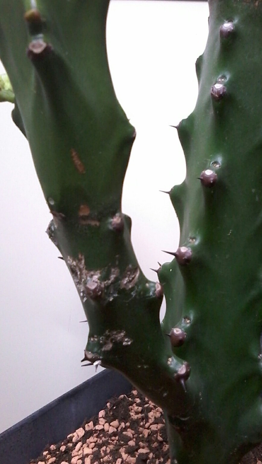 Eine meiner Euphorbien hat recht plötzlich an mehreren Stellen diese Flecken bekommen. Ich habe diese erst for kurzem bekommen und weiss nicht, was sie genau hat. Wäre toll, wenn da jemand etwas genaueres wüsste.