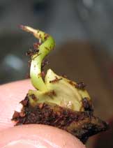 Meine Frage. Was ist das, was aus dem Samen kommt, dieser grüne Zipfel? --> Ist es die Wurzel oder ....was, das oben raus wächst -> damit ich es wieder "richtig rum" wieder setze??