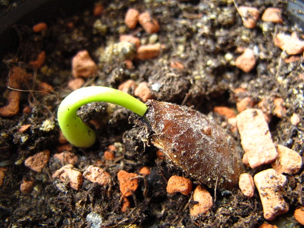 Nun steckt der Keimling mit beiden Seiten in der Erde.