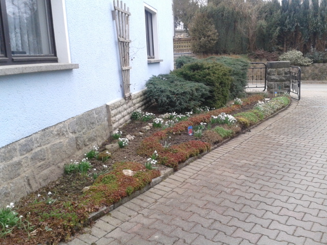 Die Beetbegrenzung beginnt mit Bordstein und bodendeckenden Stauden, o.K.