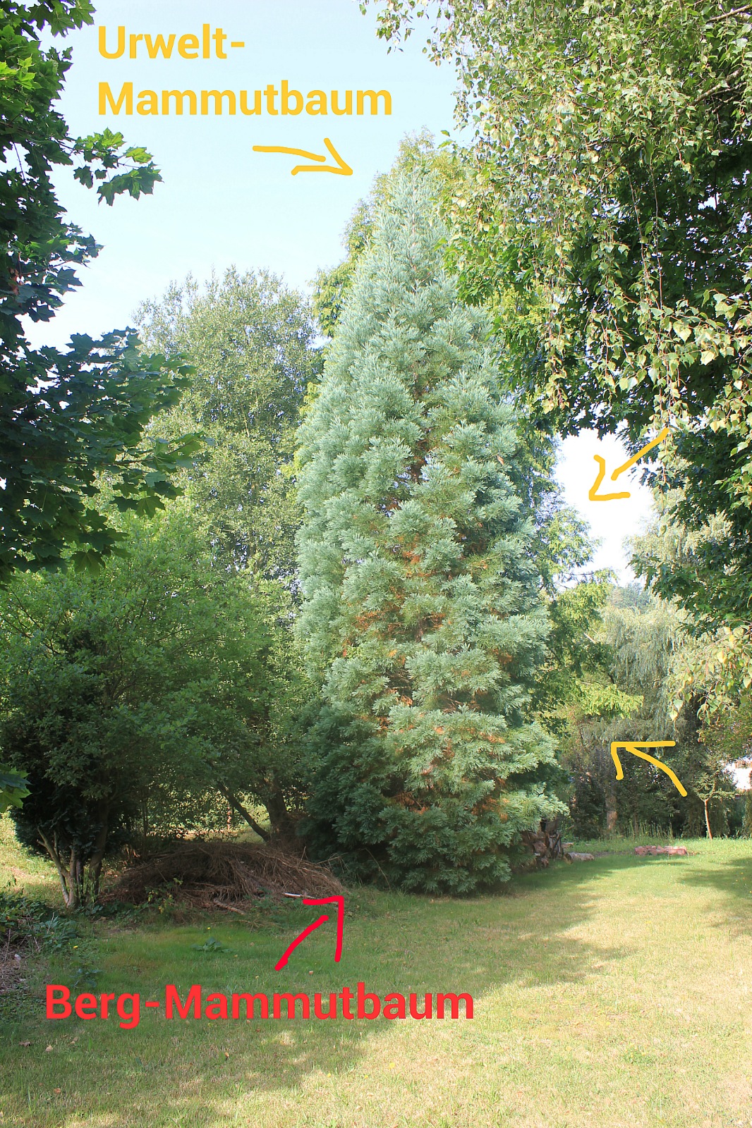 Darin stehen zwei Bäume, die ich durch Internetrecherche und mehreren Forenbeiträgen nun ziemlich sicher, dass es sich dabei um zwei Mammutbäume handelt. Der eine scheint ein Sequoiadendron giganteum (Berg-Mammutbaum) und der andere ein Metasequoia glyptostroboides (Urwelt-Mammutbaum). Beide sind laut Angaben der Nachbarn etwa 20 Jahre alt. Geschätzt sind beide etwa 12 bis 15 Meter hoch.
