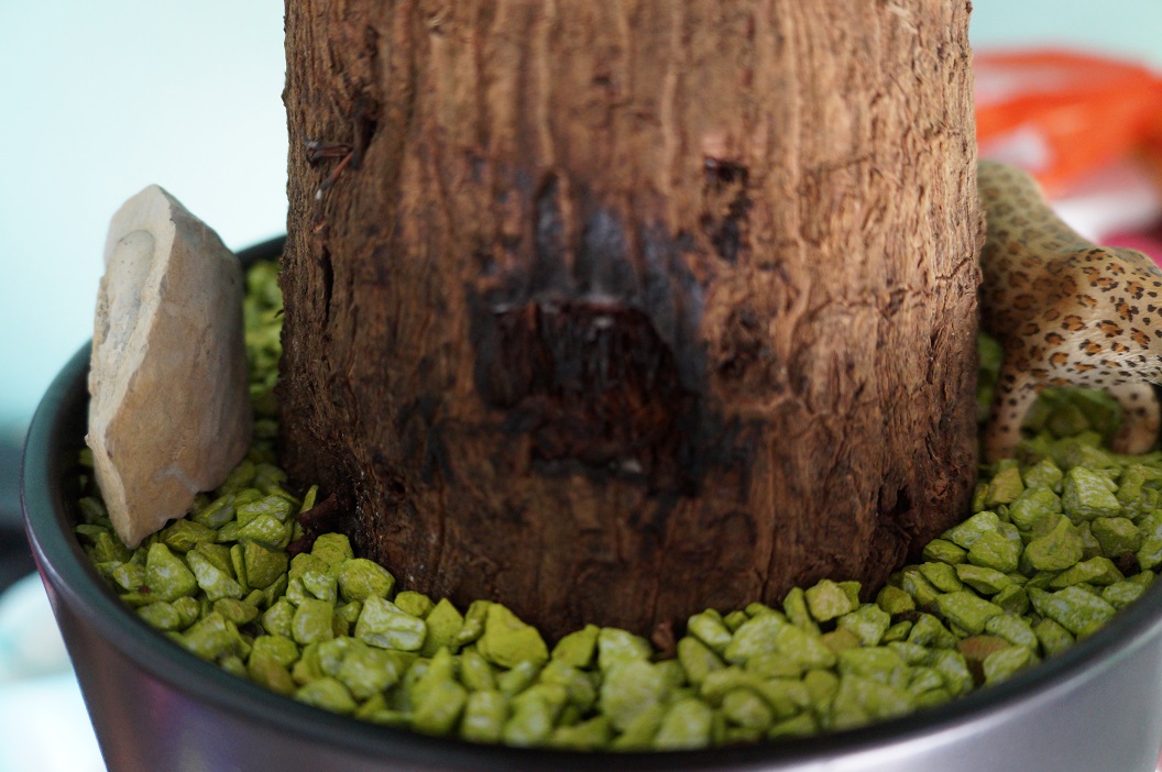 Der Topf ist ohne Loch unten drin, ich dachte mir, da die Pflanze erstens in Seramis und zweitens nur mäßig gegossen wird, bräuchte sie keinen Topf mit Loch. Und es sieht ohne "Untertasse" in der Wohnung halt schöner aus. Oben, praktisch die letzen 1-2 cm, nur für die Optik, habe ich den Topf mit so grünen Steinchen gefüllt (gefärbte Steinchen). Habe sie um den Stamm gelegt, da die mir besser gefielen als das tonfarbene Seramis (eigentlich waren die grünen Steinchen wohl für Orchideen, gabs in allen möglichen Farben, sollen wohl auch Pilze, Schädlinge usw. etwas abhalten und auch etwas düngen. Denke mal nicht, dass mir die "Orchideen-Steinchen" jetzt die Yucca geplättet haben..... Mal abgesehen davon, dass ich nicht den gesamten Topf damit gefüllt habe, sondern sie nur oben um den Stamm rum gelegt habe.)