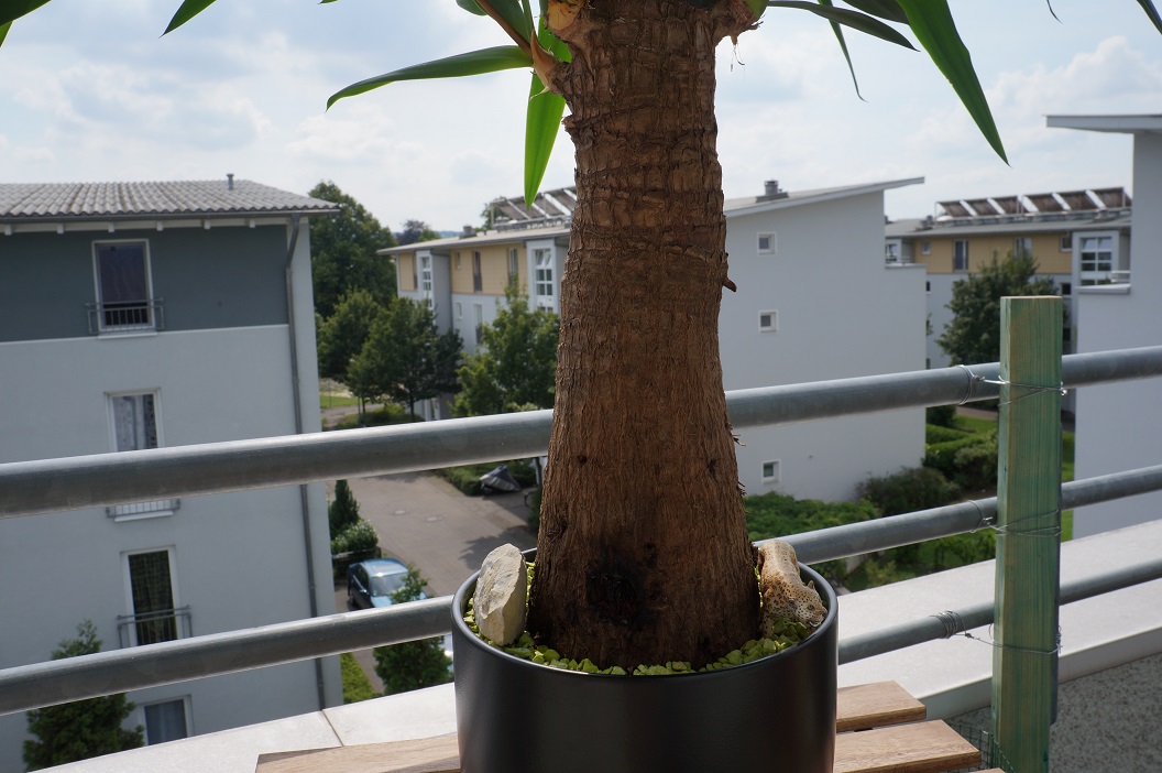 Da hatte ich mir noch keine Sorgen gemacht, habe einfach das Gießen eingestellt und sie weiterhin täglich in die Sonne gestellt, wenn sie denn mal schien (inzwischen auch mehr mit der Intention, dass das einfach trocknet). Gesagt getan, Stelle trocknete wieder und die Yucca kam zusammen mit anderen Pflanzen wieder täglich auf ihr Balkontischchen um Sonne zu "tanken". Das ist jetzt etwa 3-4 Wochen her. Habe dann wohl (ich weiß) dämlicherweise erneut ein einziges mal gegossen, dezent...