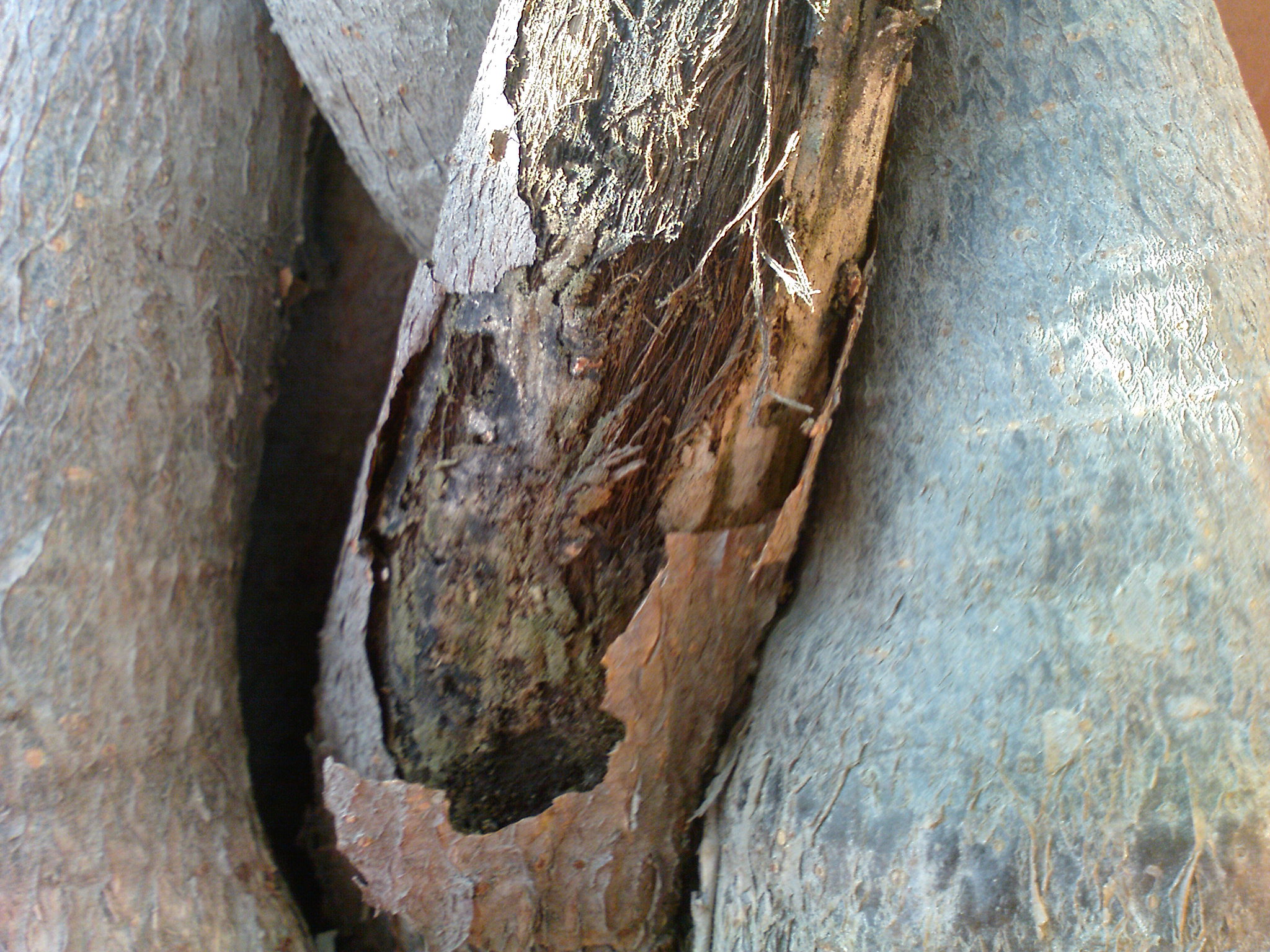 Einer der Stämme ist ganz feucht und weich. Die Rinde geht sogar ohne weiteres ab. An diesem Stamm wachsen auch keinerlei Blätter!