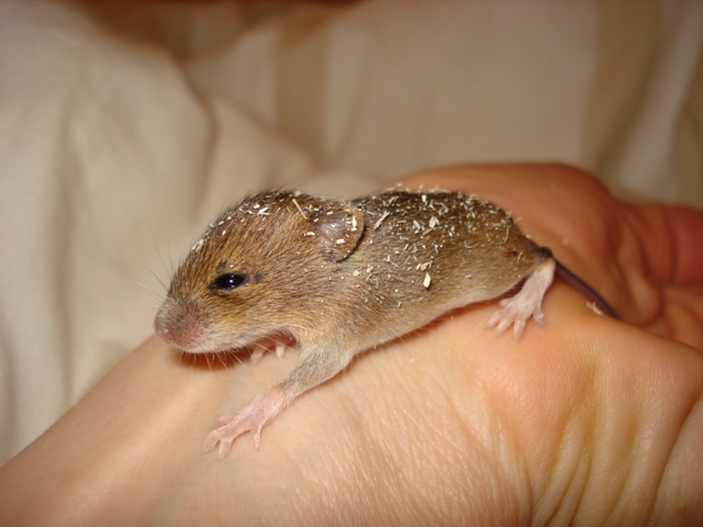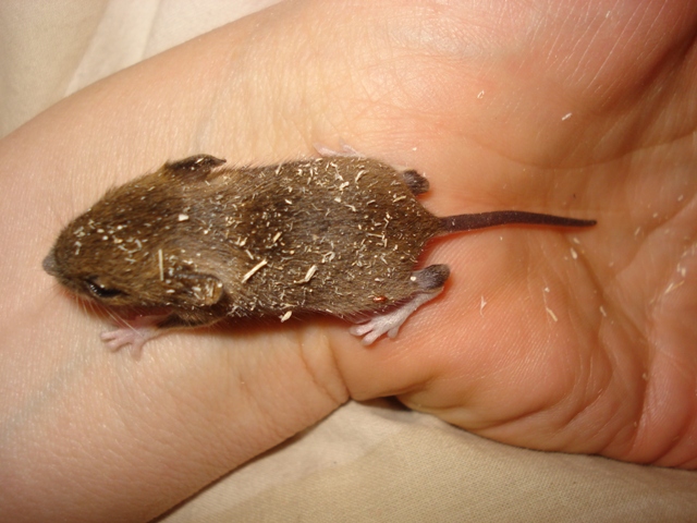 Sie war am Komposthaufen auseinandernehme mit der Stechgabel und hat dann in ein Mäusenest hineingestochen. Die Mutter ist sofort weggerannt, zurückgelassen hat sie 3-4 Junge.