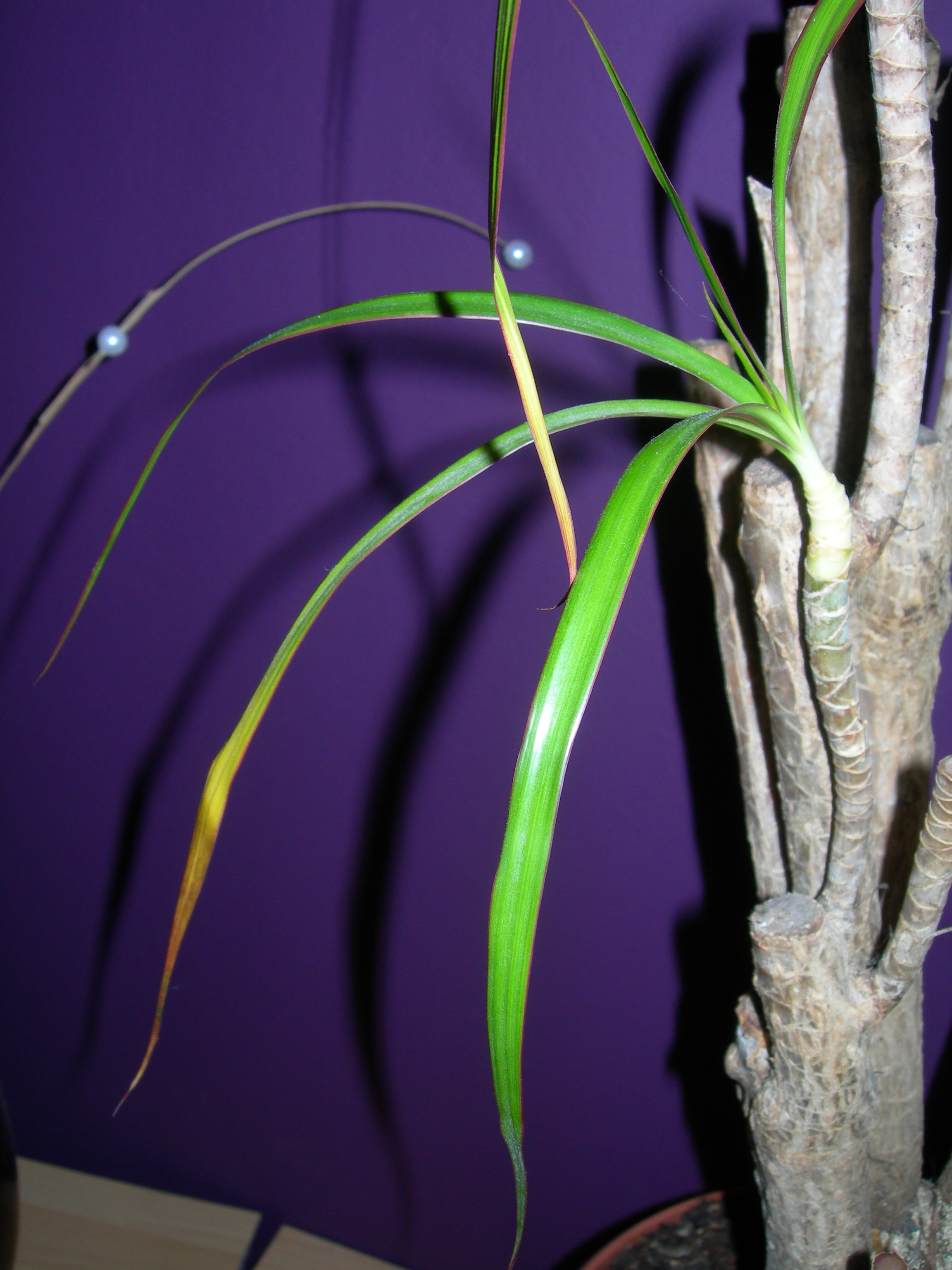 ich bin etwas am Verzweifeln, da mir mein Drachenbaum eingeht. Die Blätter werden alle ganz gelb und fallen ab (er ist schon ganz kahl), der Teil der Verästelungen (also vom Stamm) aus denen die Blätter kommen ist weißlich (so ca. 2-3 cm bevor die Blätter rauskommen --> siehe Bild) und es fühlt sich so an als wär die Rinde lose und Luft zwischen Rinde und Innenstamm so quasi..