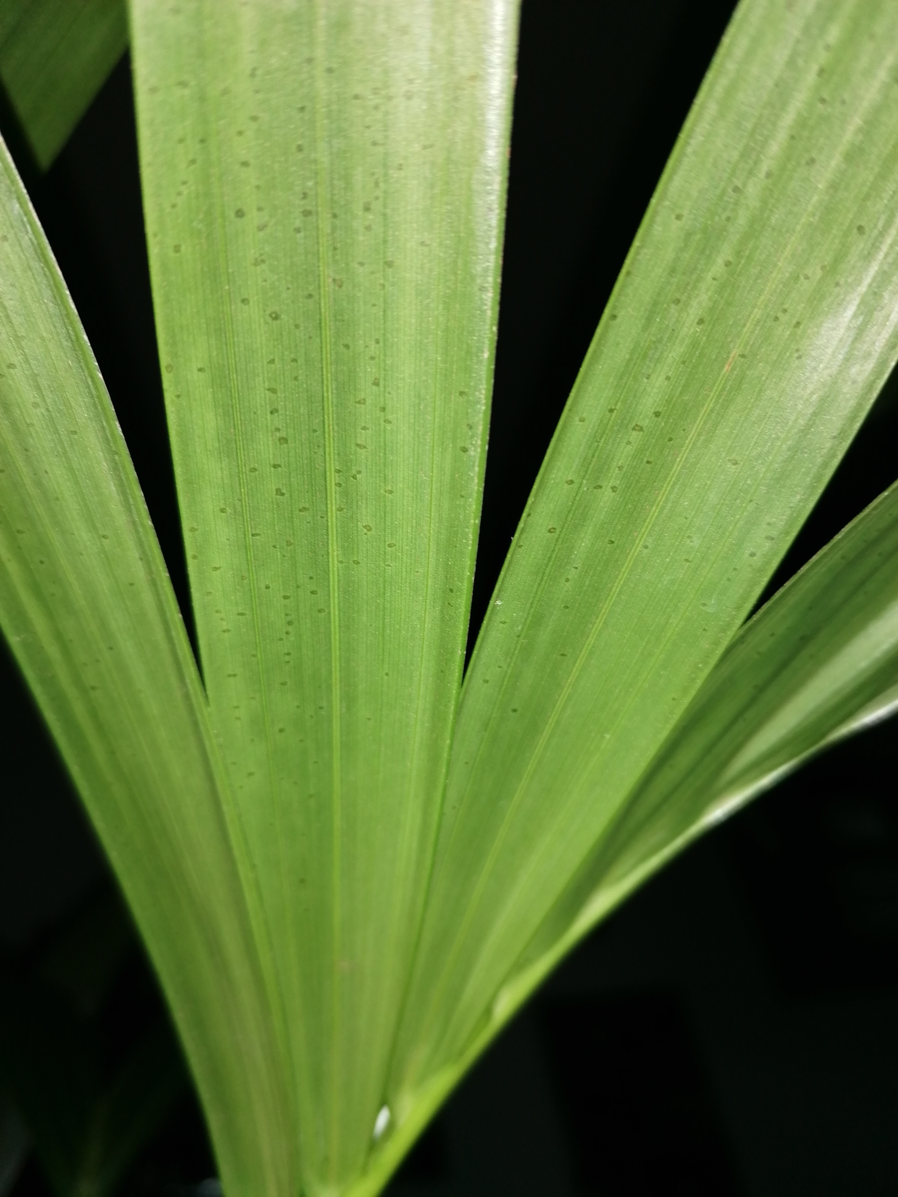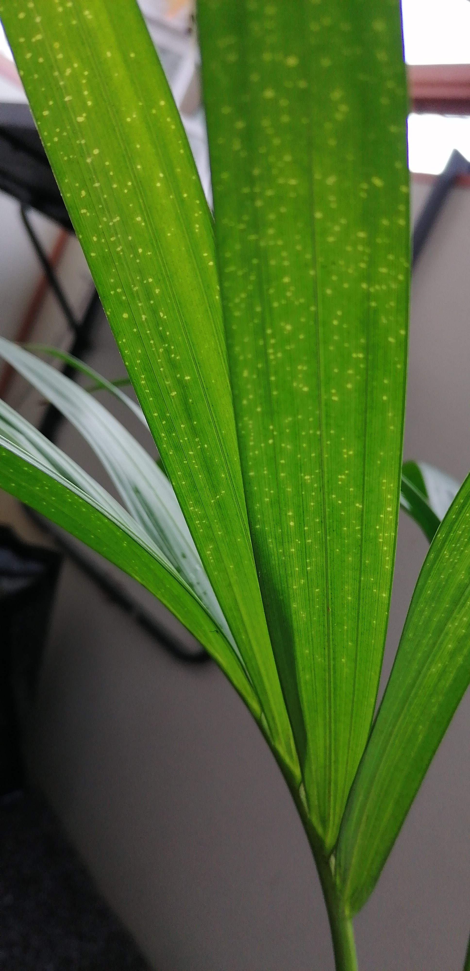 Es geht um meine 1,5 Jahre alte Kentia Palme. Diese wuchs im letzten Sommer sehr schön. Ich habe sie Ende März in neues Substrat gesteckt, sie wird wenig mit Regenwasser gegossen, täglich besprüht und steht mit einer Goldfruchtpalme sowie Hanfpalme am großen Ostfenster, bekommt demnach nicht die volle Mittagssonne ab, aber hat es täglich sehr hell. Ich habe sie mir gestern mal wieder genauer angeschaut und beim Lichteinfall seltsames entdecken können. Es fallen kleine gelbe Punkte in den Blättern auf und sie erschien mir im letzten Jahr satter grün. Ich hab gelesen und gelesen und gelesen. Einen Tierchenbefall konnte ich schlicht nicht feststellen. Leider sie manchmal an der Blattfleckenkrankheit, einem Pilzbefall? Kennt sich damit jemand aus und hat Ahnung, wie man in diesem Fall am besten vorgeht? Mir ist die Heilung bzw Behandlung sehr wichtig. Meine Floristin tippt auch auf einen Pilz.. Ich habe Bilder angehangen.
