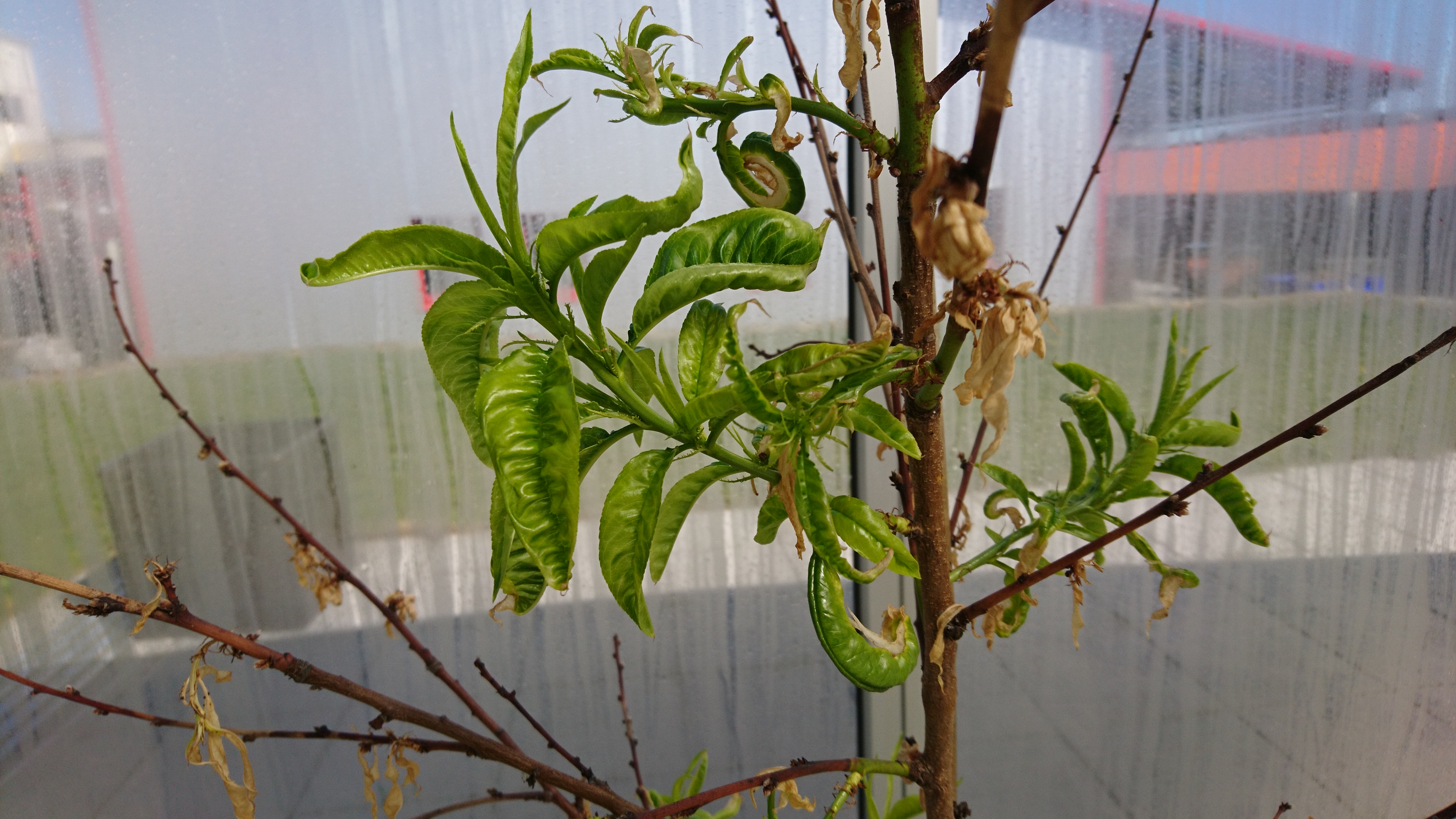 Ich bin noch immer der Meinung, dass die Nektarine nicht an der Kräuselkrankheit leidet. Meine hatte sie, und da sahen die Blätter anders verunstaltet aus, mit rötlichen bis tiefroten Blasengebilden übersät. Ich denke noch immer, dass die Blätter hier so missgebildet sind, mit den hellbraun eingetrockneten Blattpartien, weil sie in der dunklen Garage unter unnatürlichen Bedingungen entstanden sind und keine Chance zum gesunden, robusten Gedeihen hatten.