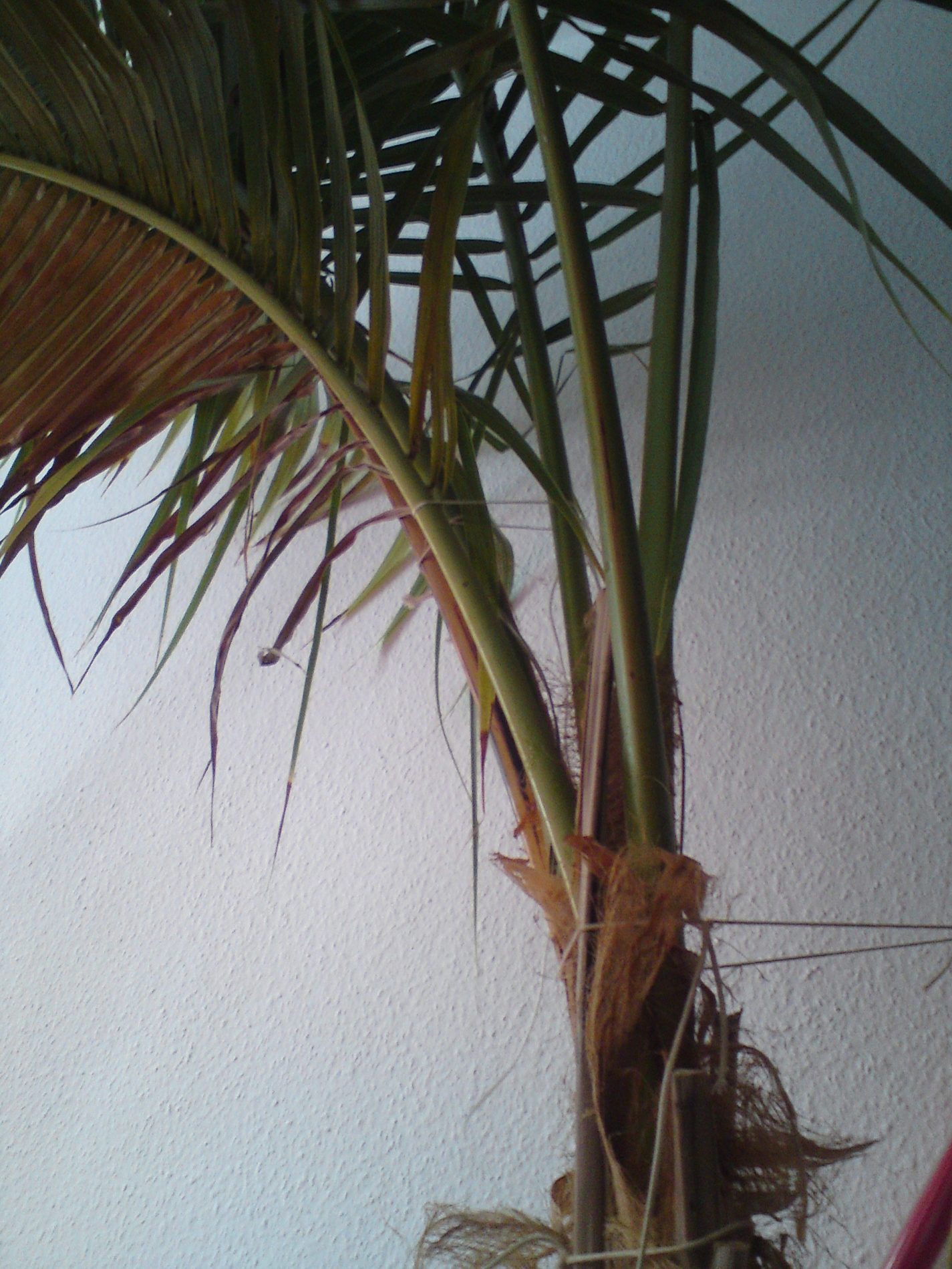 Ich habe vor einem halbem Jahr eine riesige Palme erworben. Sie war in einem Plastiktopf zwecks Transport. Zuerst hatte ich sie in einem großen Raum stehen, wo allerdings jedesmal die Tür daran kam wenn man sie geöffnet hat. Dann habe ich sie in ein anderes Zimmer gestellt, was wesentlich kleiner ist. Was aber nicht das Problem ist, denk ich. Gleichzeitig, habe ich sie umgetopft in einen grpßen Terracottatopf. Sie an der Wand festgebunden, damit sie nicht umfällt, weil sie wirklich riesig ist.