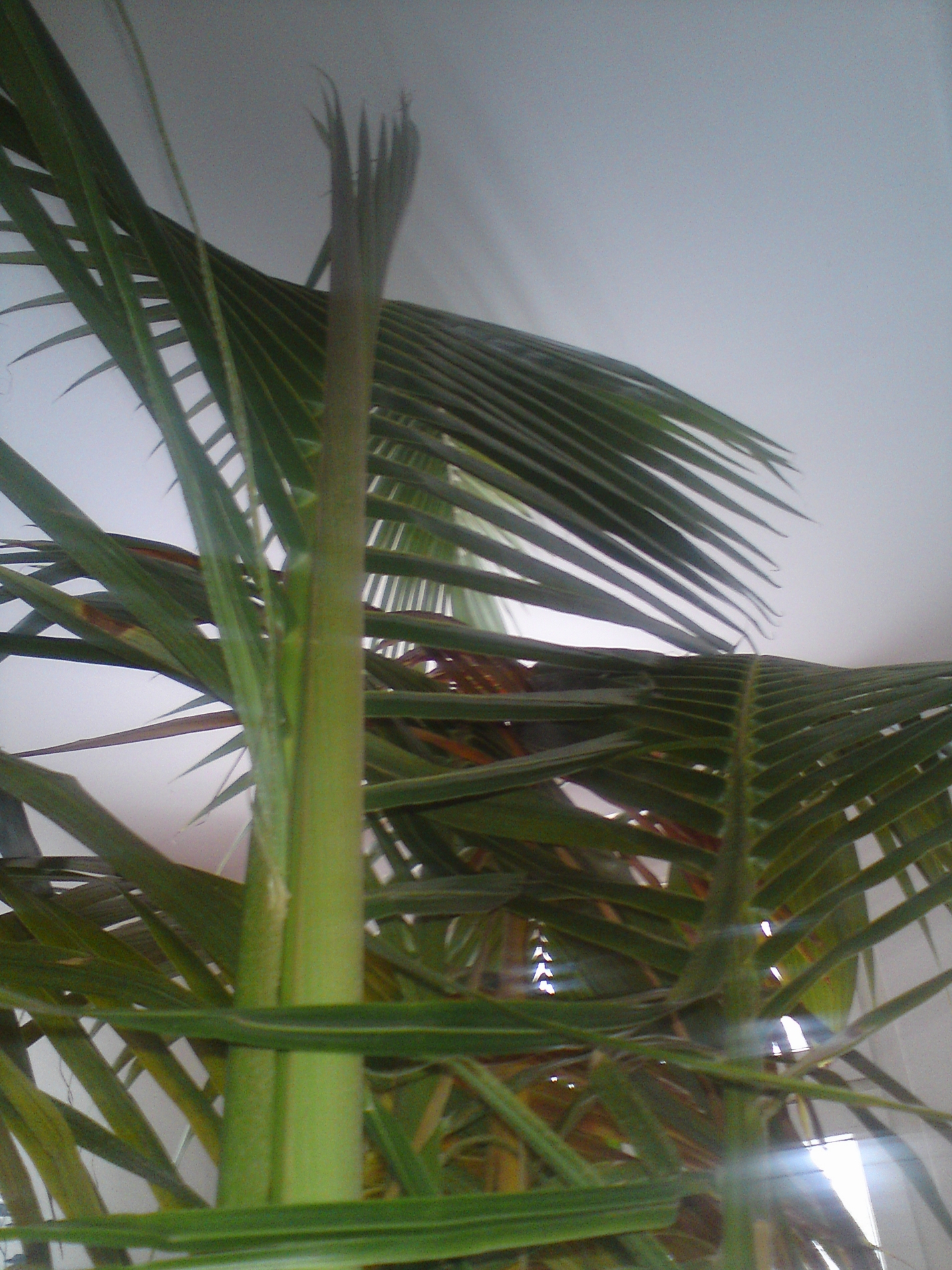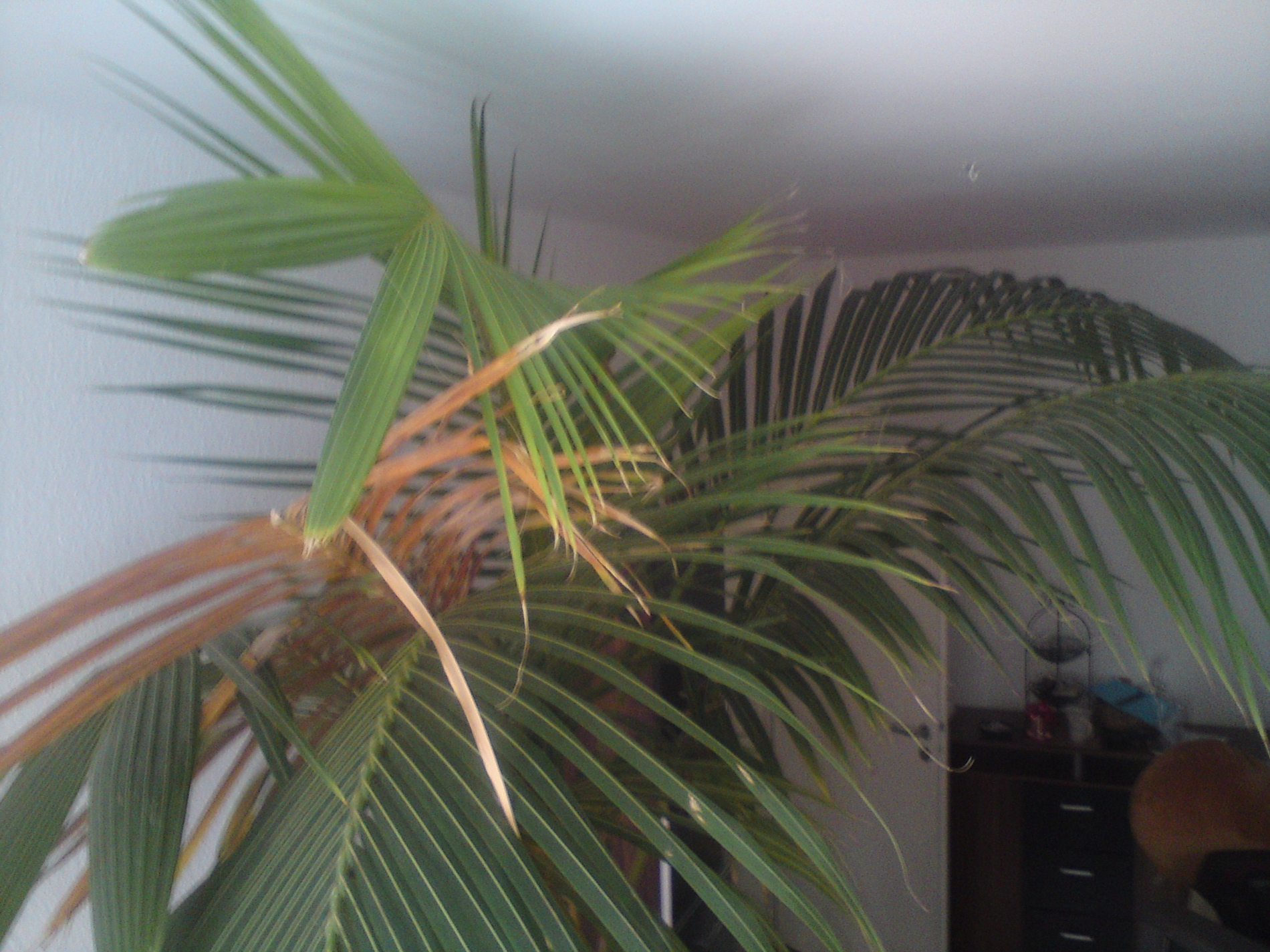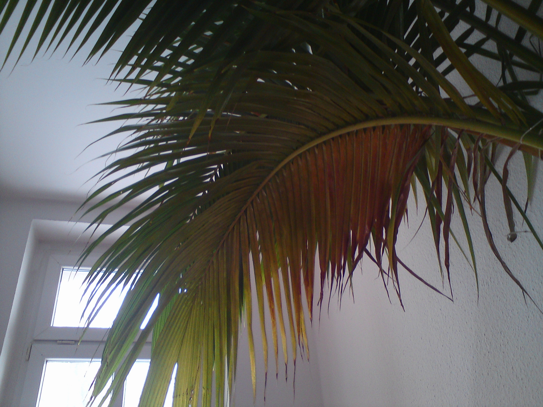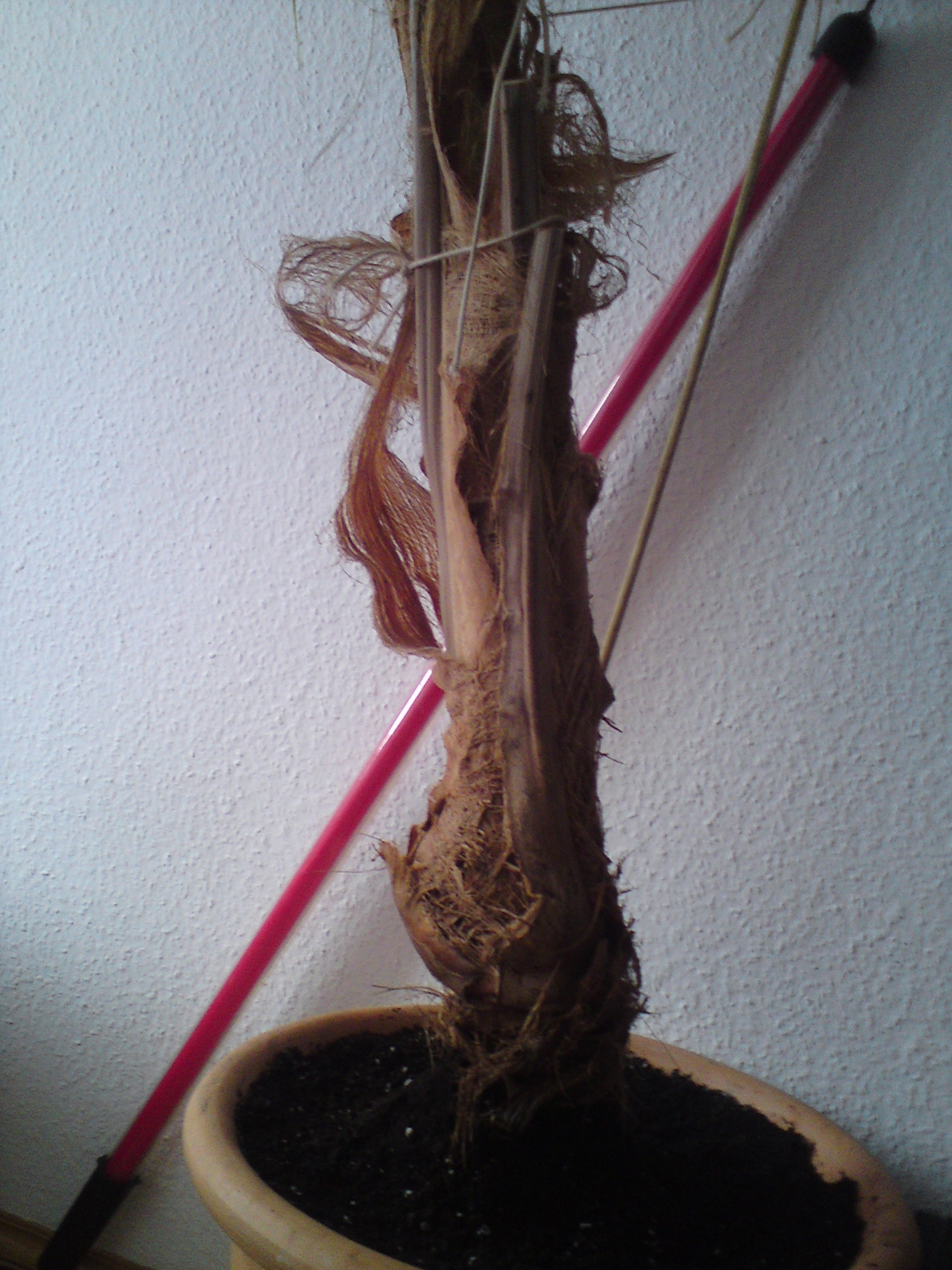 Ich habe vor einem halbem Jahr eine riesige Palme erworben. Sie war in einem Plastiktopf zwecks Transport. Zuerst hatte ich sie in einem großen Raum stehen, wo allerdings jedesmal die Tür daran kam wenn man sie geöffnet hat. Dann habe ich sie in ein anderes Zimmer gestellt, was wesentlich kleiner ist. Was aber nicht das Problem ist, denk ich. Gleichzeitig, habe ich sie umgetopft in einen grpßen Terracottatopf. Sie an der Wand festgebunden, damit sie nicht umfällt, weil sie wirklich riesig ist.