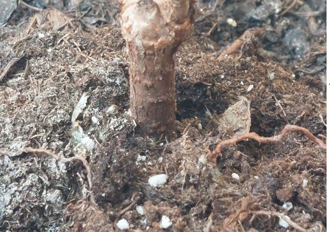 Heute hat mein Mann Michael dann festgestellt, dass um den Stamm herum eine Ausshöhlung entstanden ist und diese mit einem dichten, weißen, festen Material umsponnen wurde. In dem Loch saß eine Kellerassel!
