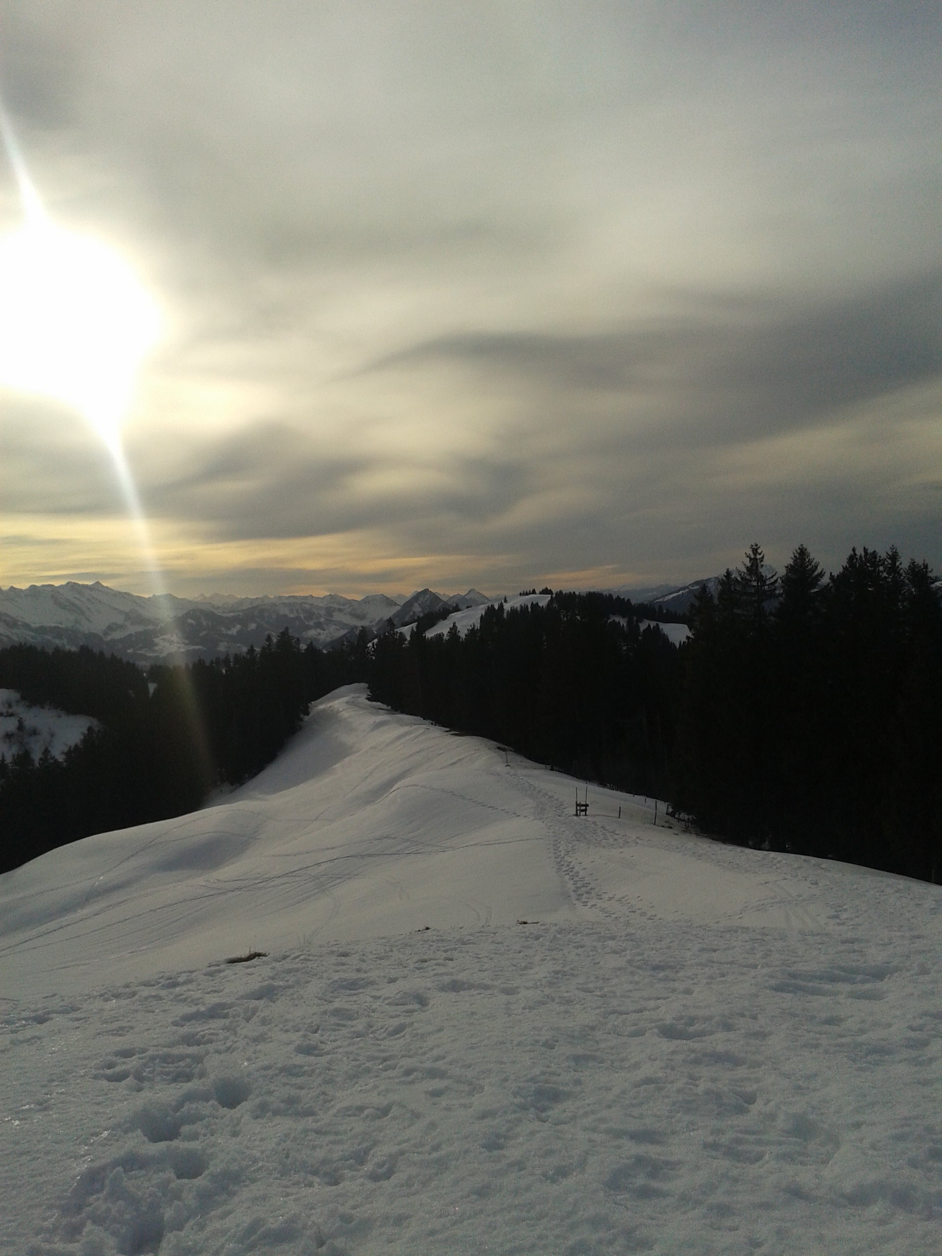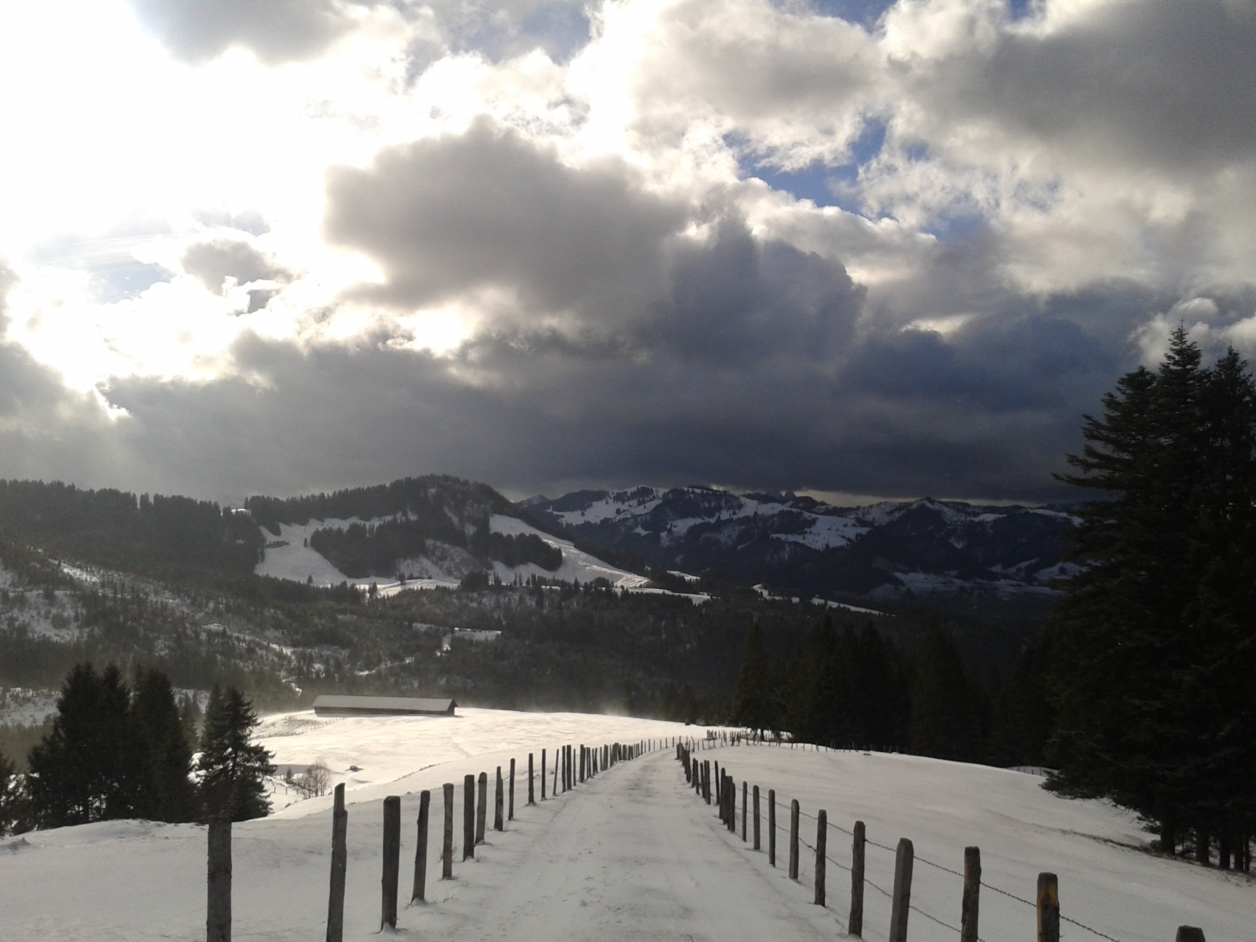 Ein stürmischer Schnee, Sonne und Wolken Wandertag. Blick vom Rinderweidhorn in Richtung Sihlsee: