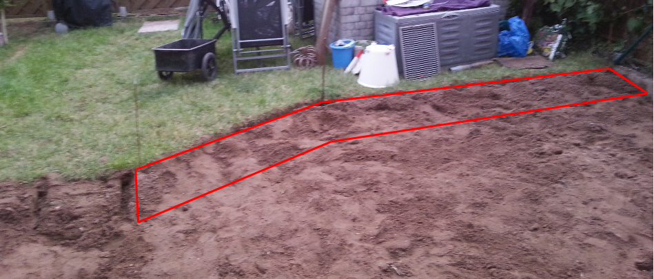 Gestern haben wir nun den Rasen abgetragen. Da wo jetzt Erde ist, wird die Terasse sein.