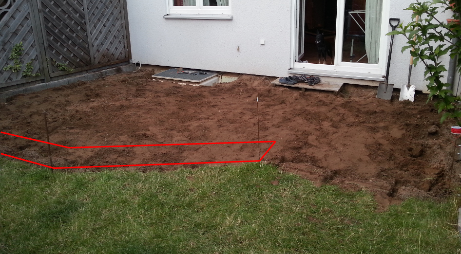 Direkt ans Haus anschließen soll die Terassenfläche, wobei links am Fenster der eigentliche Sitzplatz werden soll.