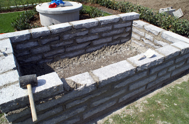 Auf das Fundament aufgeschlichtet und leicht anbetoniert wurden dann die Natursteine bis zu einer Höhe von 60 cm.