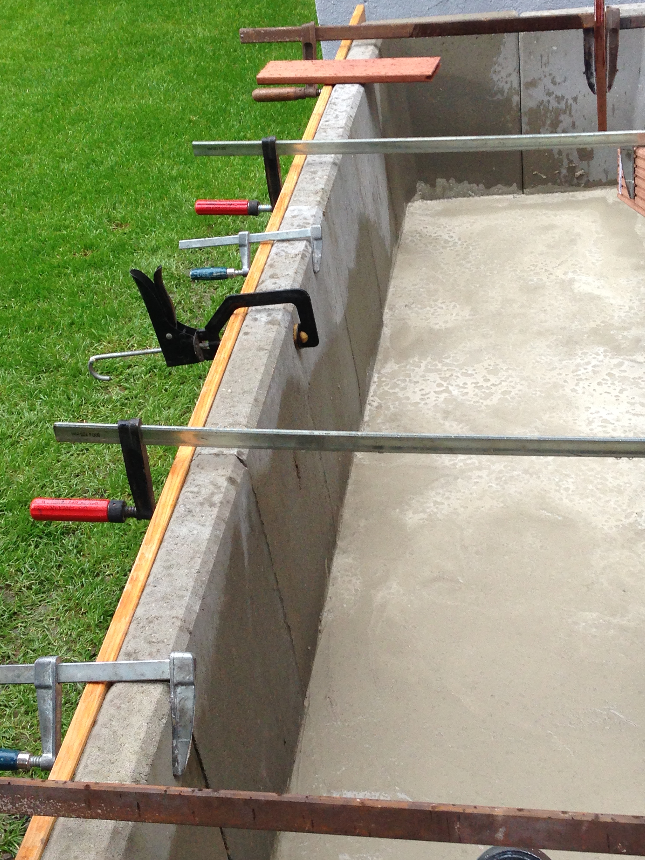 Die L Steine ausgerichtet und zwei Säcke Estrich eingefüllt.