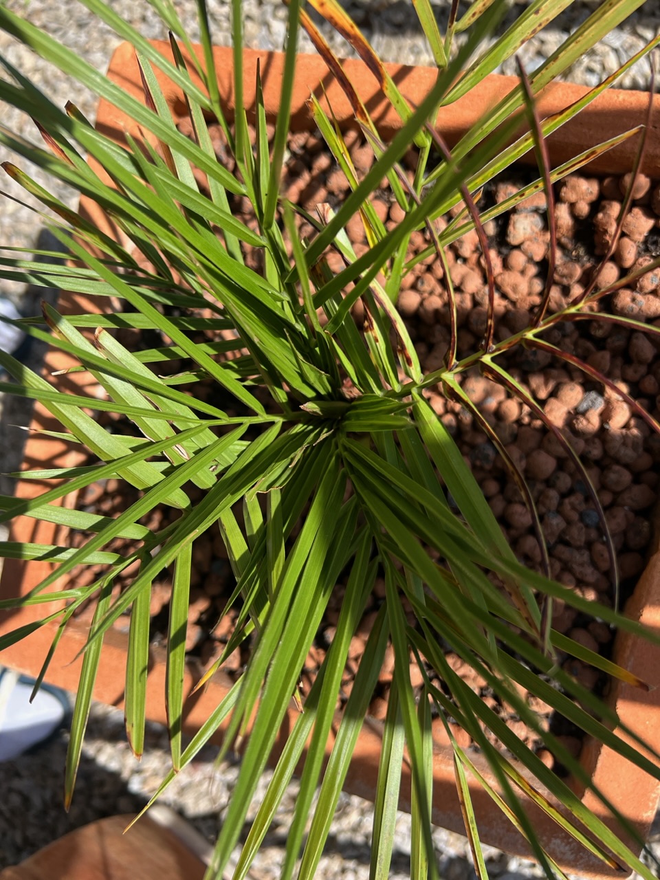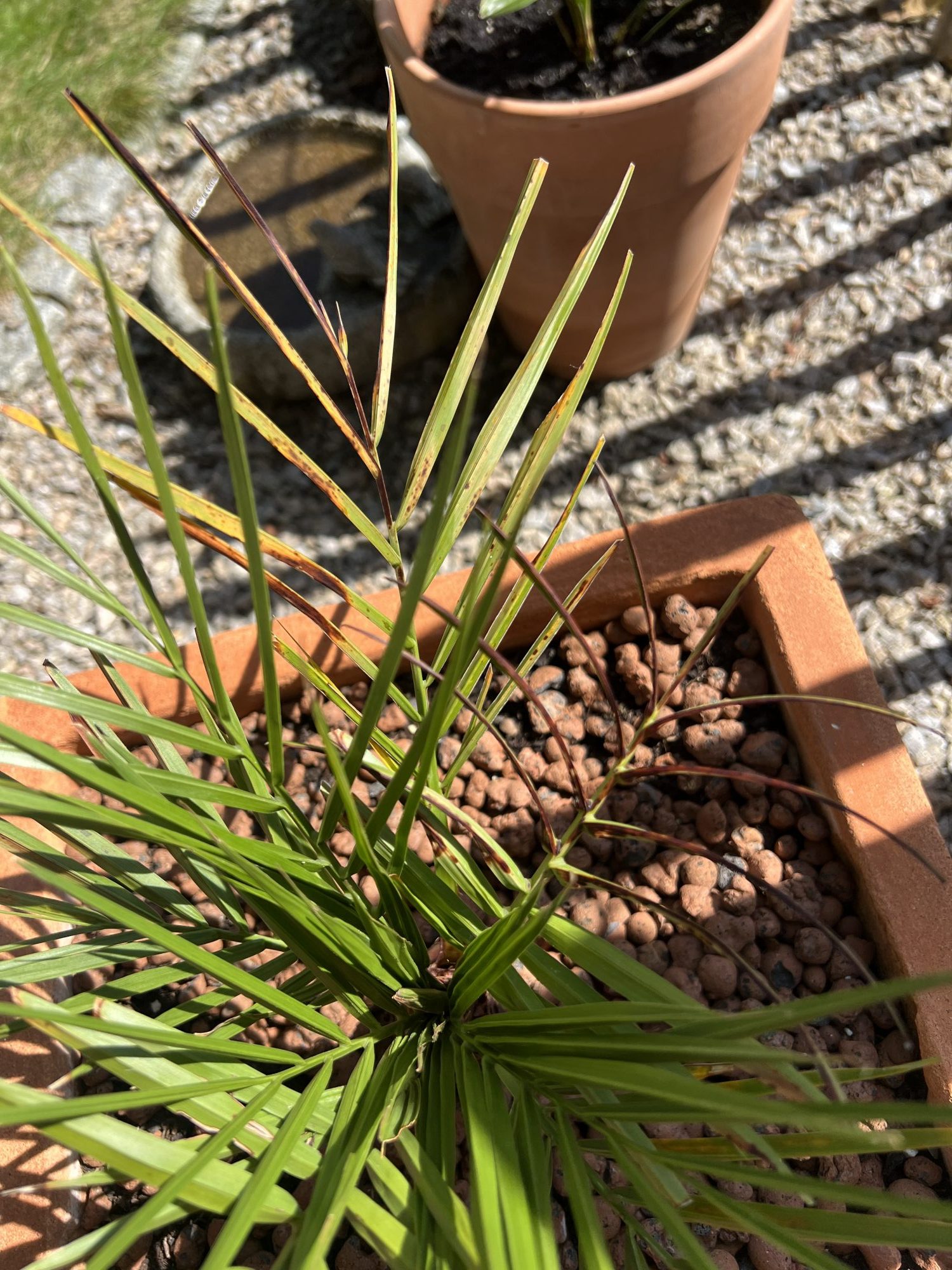 Leider sind jedoch in den letzten zwei Monaten Verfärbungen an einigen Blättern und Stängeln aufgetaucht (siehe Bilder), welche ich mir selbst nicht erklären kann. Die Palme hat meines Erachtens immer genügend Wasser bekommen (wird jeden zweiten Tag gegossen) und steht ca. den halben Tag in der Sonne, also von 11:00 -16:30 Uhr.