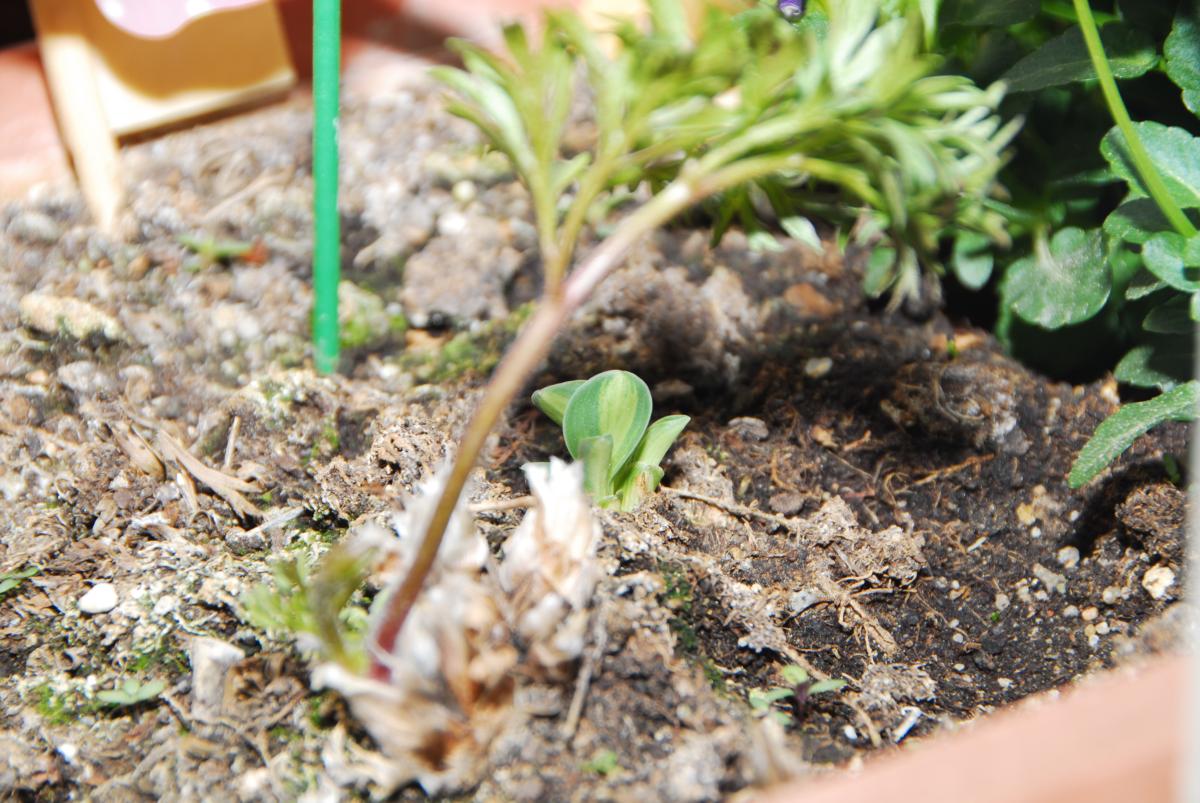 Schau mal, meine verschwunden geglaubte, hat sich schließlich doch noch bequemt. Vor ein paar Tagen gab's winzige Spitzchen zu sehen. Kein Wunder, daß mir da vorher nie was entdeckt hab - ich hatte die Stelle irgendwie weiter rechts in Erinnerung. Nicht so nahe bei der Küchenschelle. Die sah völlig tot aus und ist vorgestern plötzlich zum Leben erwacht