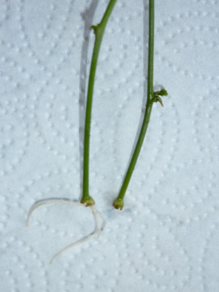 10) Nach dieser Zeit zeigt ein zaghafter Austrieb an, dass die Pflanzen gewurzelt haben. Setzt man sie in durchsichtige Plastiktöpfe kann man gleichzeitig auch eine enorme Wurzelbildung beobachten.