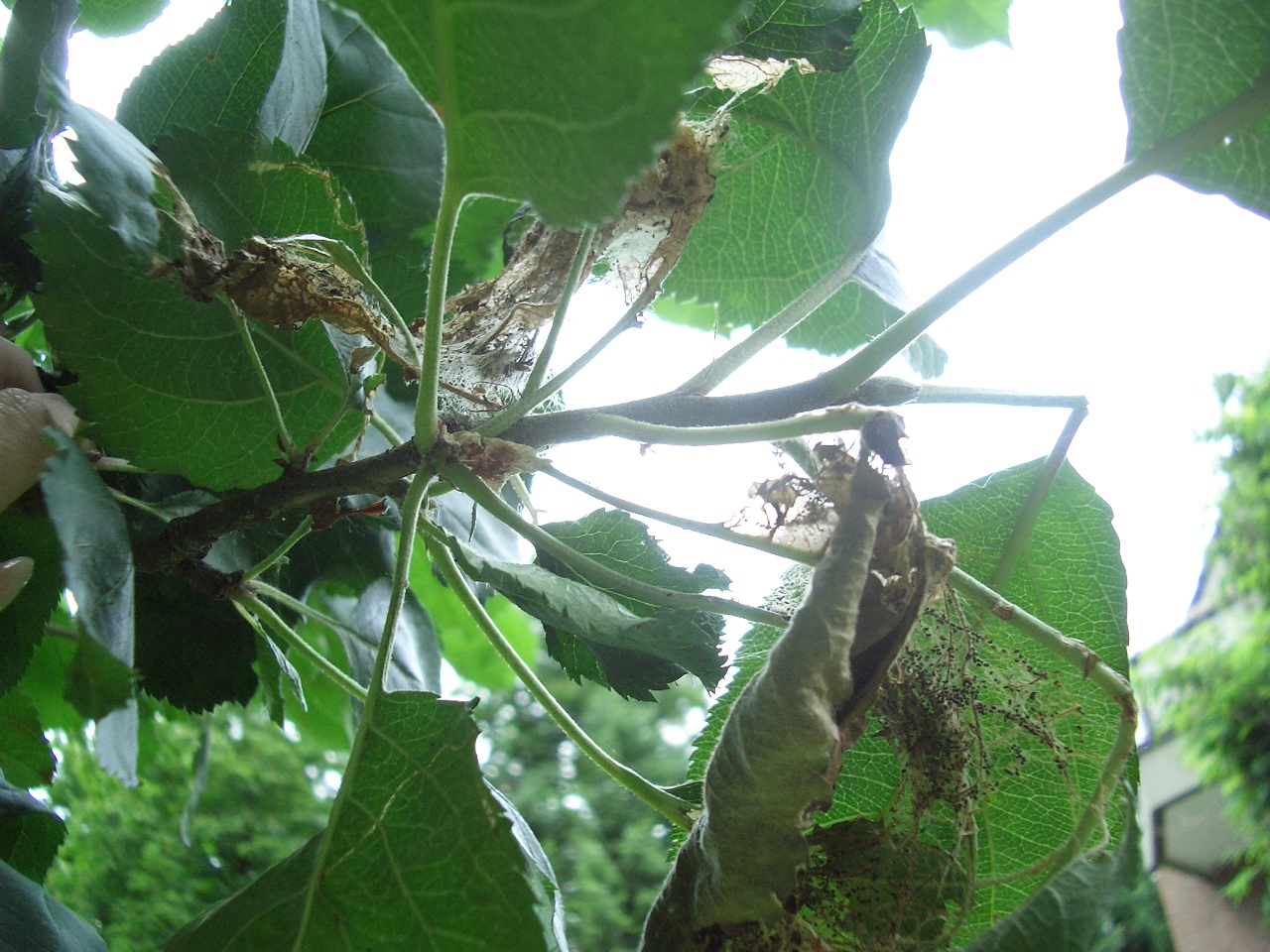 Es handelt sich um einen Nadelbaum, der stark bräunelt; ein Birnbäumchen, das wir gepflanzt haben, das seit ca. 2 Jahren bei uns steht und komische Flecken bekommt und um einen Apfelbaum, der zwar, seit wir auch vor ca. 2 Jahren ein weiteres Bäumchen, tüctig Äpfel trägt,diese aber in diesem Jahr in kleinstem Stadium bereits abwirft - bei dem habe ich dann diese Netzdinger entdeckt, die ganz unten zu sehen sind...