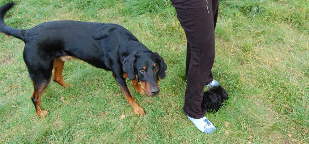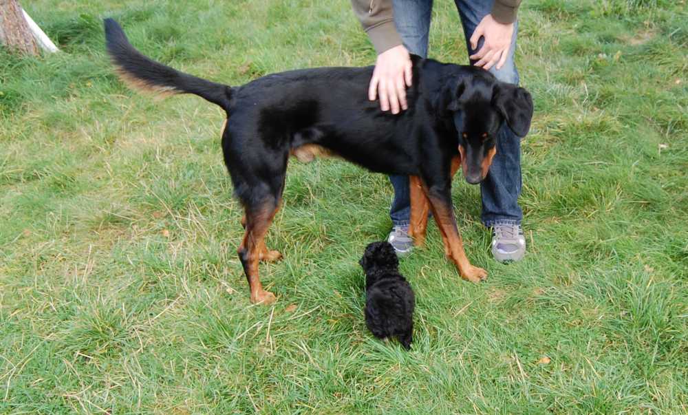 Bei uns gab's gestern Besuch in Form von Elvis einem grad mal 8 Wochen altem Toypudel-Welpen. Ich hatte ganz vergessen, wie ulkig so'n Welpe sein kann. Max als ausgesprochener Welpenliebhaber war die ganze Zeit super vorsichtig und hat sich alle Mühe gegeben, Elvis zum spielen zu animieren, hatte aber leider keinen Erfolg. Elvis hatte zwar nicht wirklich Angst war aber noch sehr unsicher. Erst wurd gewinselt als Max mal zum Kucken und Schnuppern kam... als das keinen Einfluß hatte, wurd beim nächsten Mal geknurrt, dann hat man's mal mit Schnappen versucht, was aber auch irgendwie alles nicht so ganz das Wahre war. Später ist er dann voller Elan auf Max zugestürmt, hat dann auf halber Strecke Angst vor der eigenen Courage gekriegt. Insgesamt war's für den kleinen ne Super aufregende Sache, so daß er dann nach nicht all zu langer Zeit einfach weggepennt ist... war gleich ein perfektes Anschauungsmaterial für Herrchen und Frauchen, dem kleinen Elvis nicht zu viel auf einmal zu zumuten.