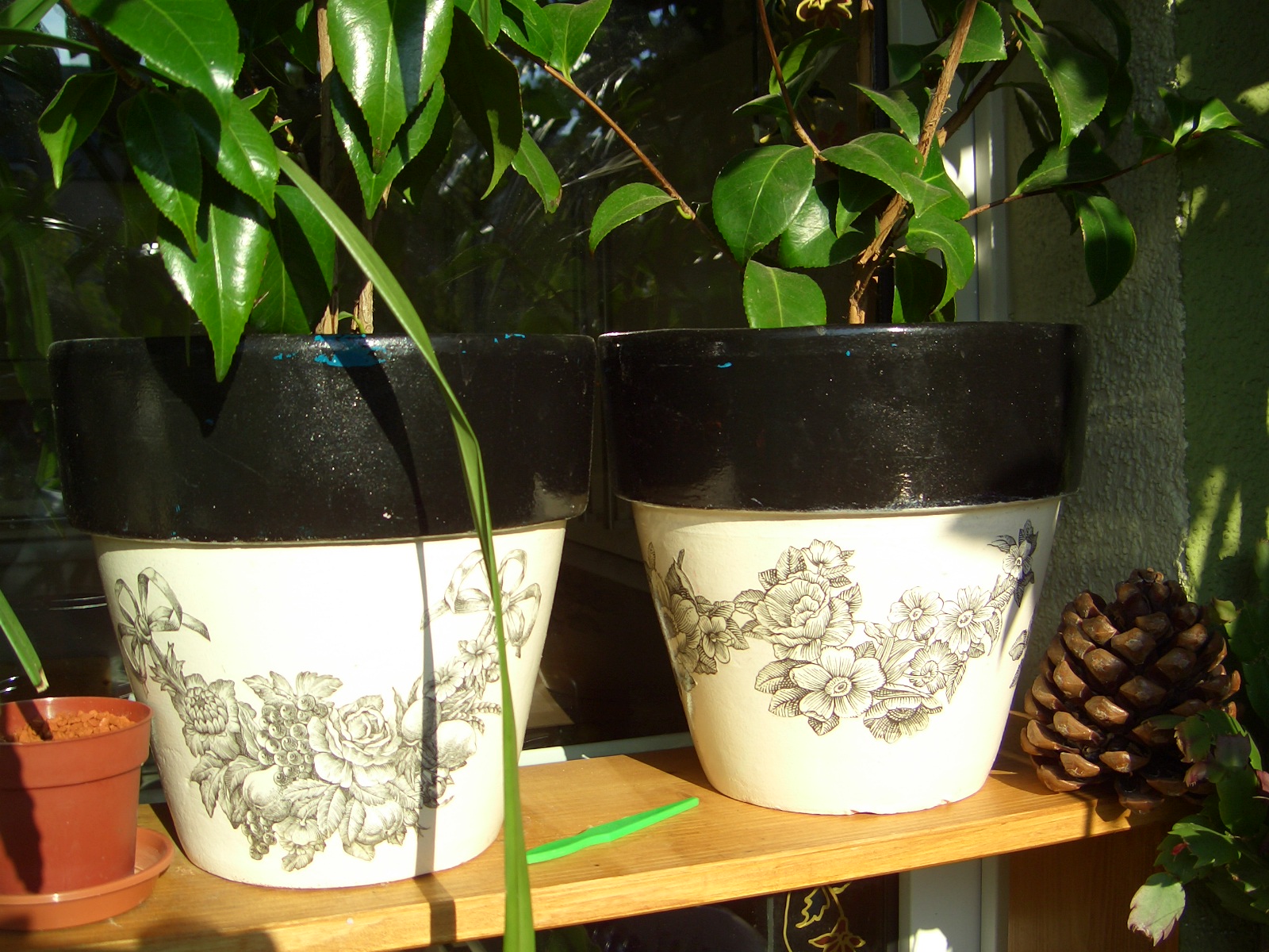 Ich will mal schon Zwei Töpfe zeigen. Ist eine Decuopagearbeit. Vorher waren die Töpfe in einem ganz häßlichem blau/tütkis.