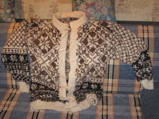 Die Wolle wurde von mir gesponnen und auch verstrickt. Die Knöpfe waren mal Tischdeko und sind aus geschälter Weide.