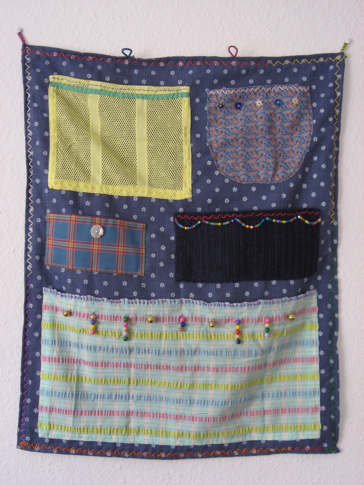das ist eine wandaufbewahrung aus stoffresten und sonst noch so allerlei klimbim, den ich so angehäuft habe. ist natürlich fürs baby, das werde ich wahrscheinlich an die wand bei der wickelgelegenheit hängen. als windelaufbewahrung und was man sonst noch so alles zur pflege braucht. und später kann das kleine das ding im zimmer haben...