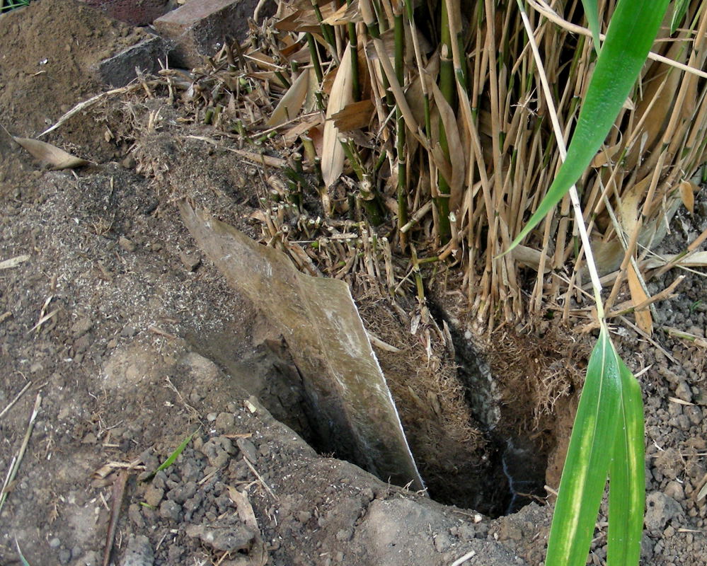 Geeignete materialien für rhizomsperren sind laut einer untersuchung der fh Weihenstephan(?) HDPE oder Polyester-vlies.