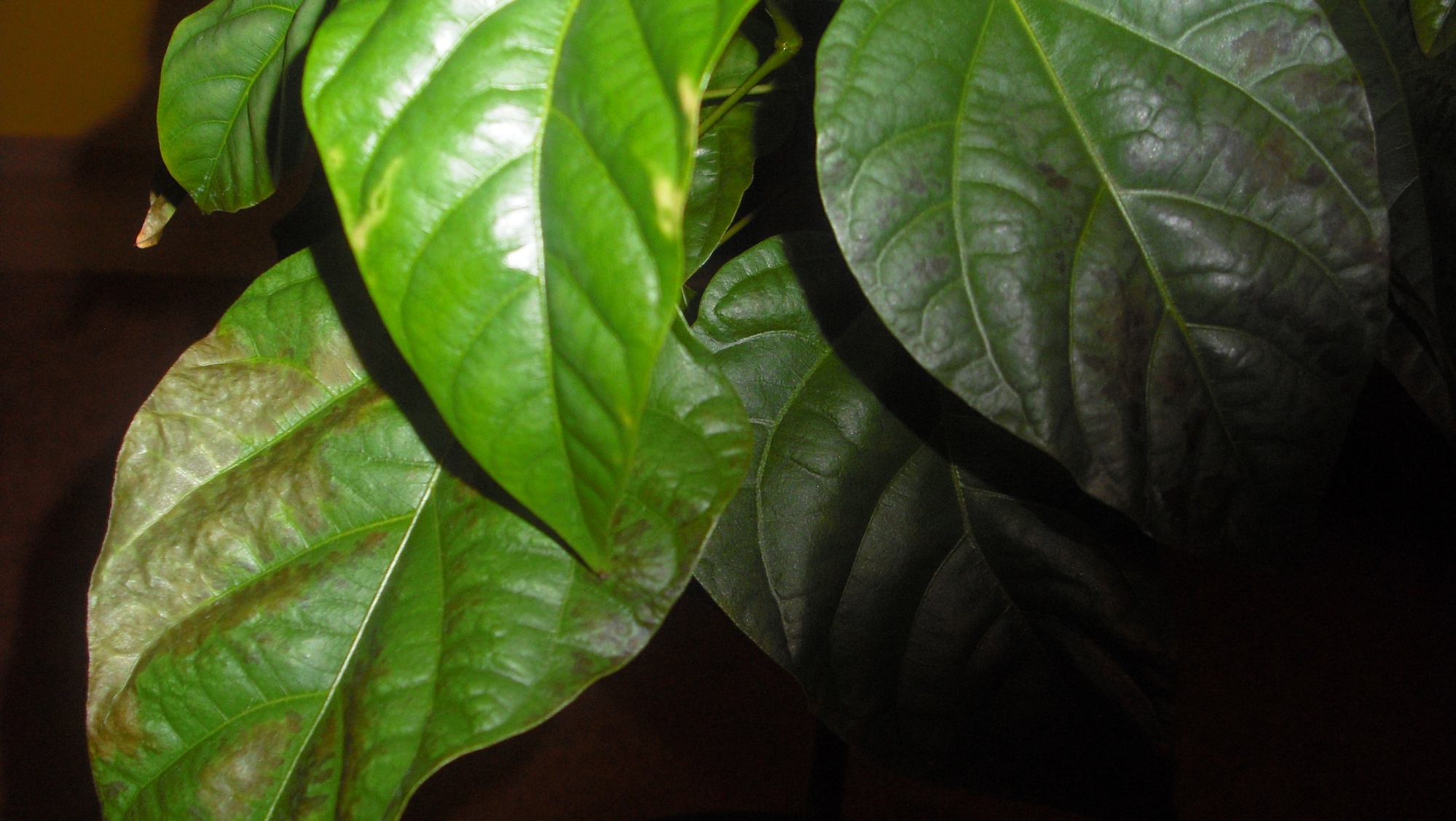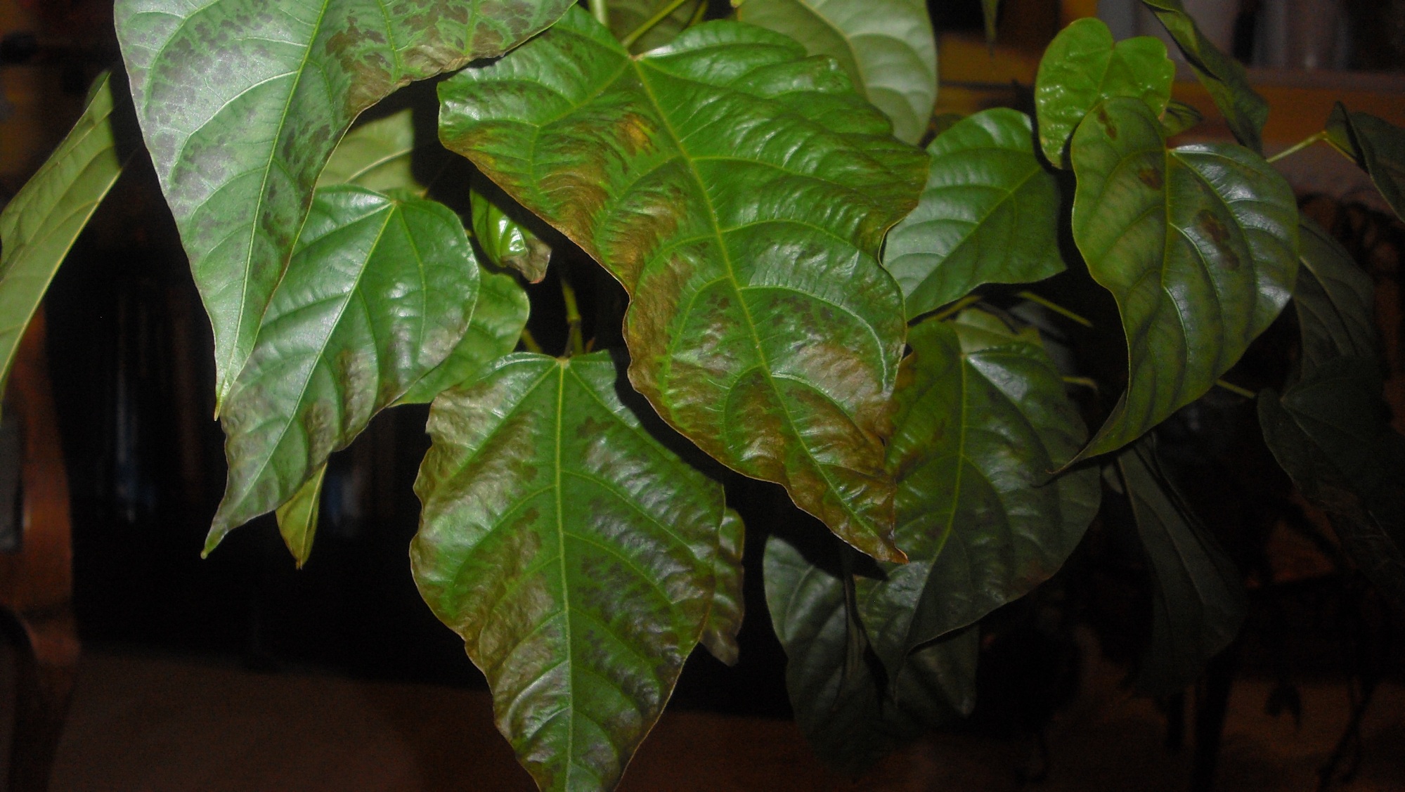 Anfangs hat er gelbe Blätter bekommen, die dann abgefallen sind. Aber das war wahrscheinlich nur wegen dem Wechsel auf Heizungsluft. Mittlereweile bekommen die Blätter vom Rand her schwarze Verfärbungen und fallen bei der kleinsten Berührung, bzw. von alleine ab. Sie trocknen nicht mal aus.