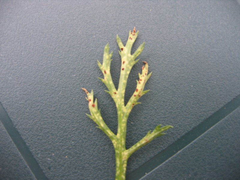 2. an einem gelben Magarittenstämmchen, vertrocknen von innen die Blätter, nachdem sie von kleinen braunen punkten befallen waren. Ich kann es nicht deuten, ob es sich hier um ein Tier oder einen Pilz handelt.
