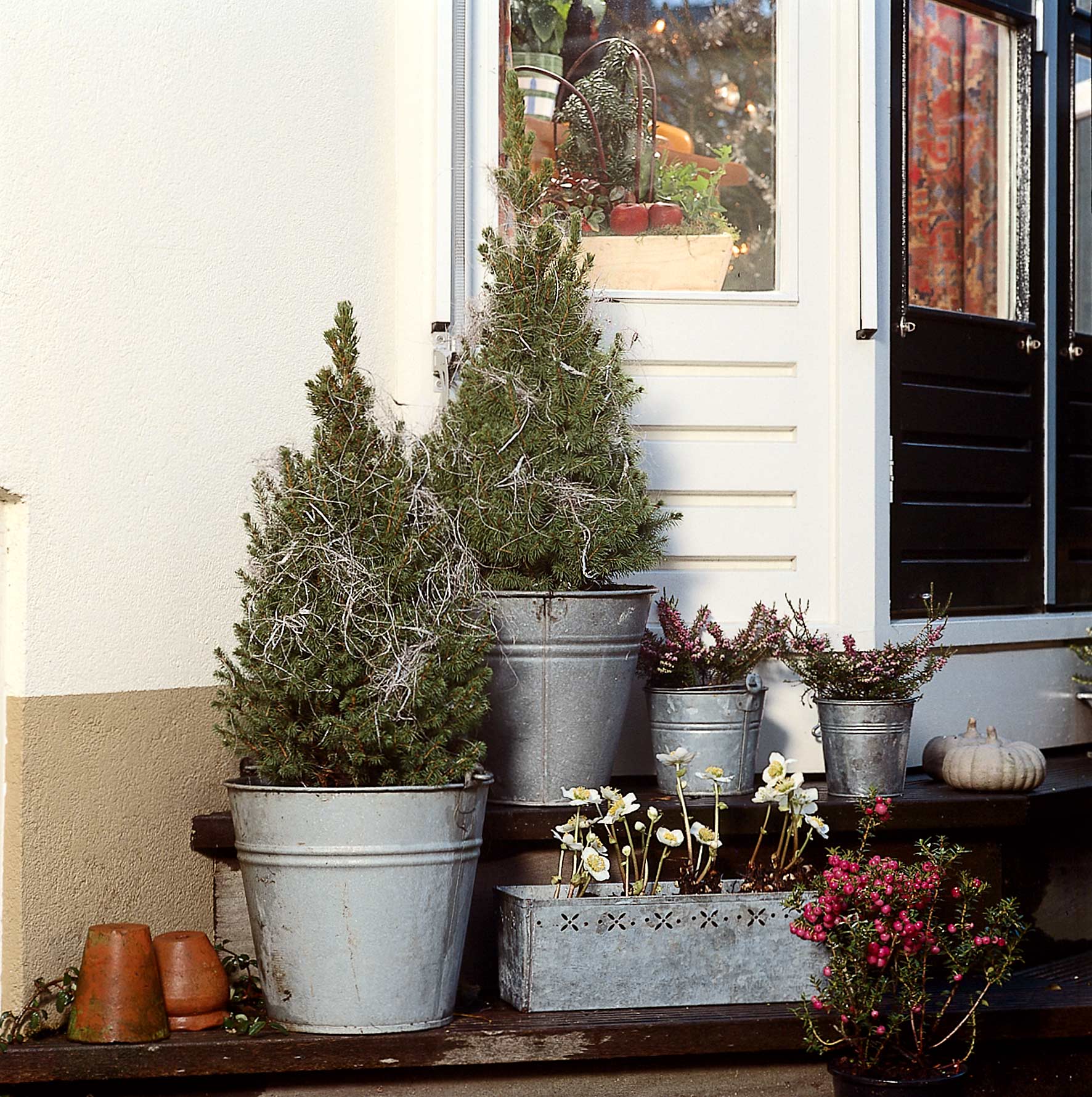 Sogar einige Stauden sorgen im winterlichen Balkonkasten oder Terrassenkübel für Begrünung. Immer- und wintergrüne Stauden wie zum Beispiel Schleifenblume, Flammenblume, Fetthenne, Steinbrech und Hauswurz trotzen mit ihren dicken Blättern frostigen Temperaturen. Die verblühten Fruchtstände von zum Beispiel Sonnenhut, Kugeldisteln oder Fetthennen sehen in der Wintersonne ? mit Raureifkristallen überzogen ? sehr ansprechend aus. Dazu passen Gräser wie Lampenputzergras, Japansegge, Bärenfellgras und Blauschwingel, die den ganzen Winter hindurch für Struktur im Kasten oder Kübel sorgen. Richtige Blüten mitten im Winter zeigt die Christrose (Helleborus niger). Dieses etwa 20 bis 30 cm hohe Juwel aus dem Reich der Stauden blüht ab Dezember bis in den März. Ihre großen, schalenförmigen Blüten sind meistens schneeweiß, manchmal mit einem Hauch von Rosa, und bilden einen wunderschönen Kontrast zu den dunkelgrünen Blättern.