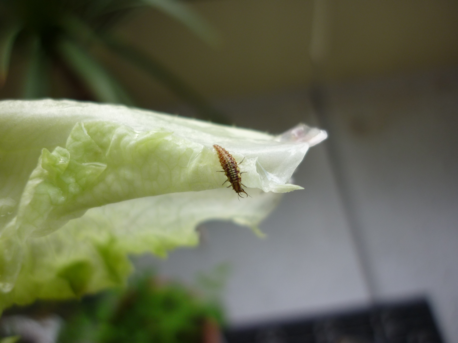vor etwa einem Monat fand ich im gekauften Salat ein merkwürdiges Insekt mit Greifzangen. Das hab ich natürlich fotografiert, bevor ich es auf dem Balkon ausgesetzt habe.