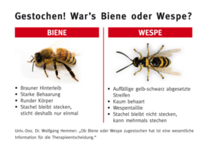 Um rasch eine Therapie gegen das richtige Gift einleiten zu können, ist es wichtig zu wissen, wogegen sich die allergische Reaktion genau richtet. Hemmer: "Trotz Ausnahmezustand sollte man darauf achten, ob Biene oder Wespe zugestochen hat." Meist können die Patienten nicht unterscheiden, welches Insekt sie gestochen hat oder es vergeht zu viel Zeit und die Erinnerung an den Stich verblasst.