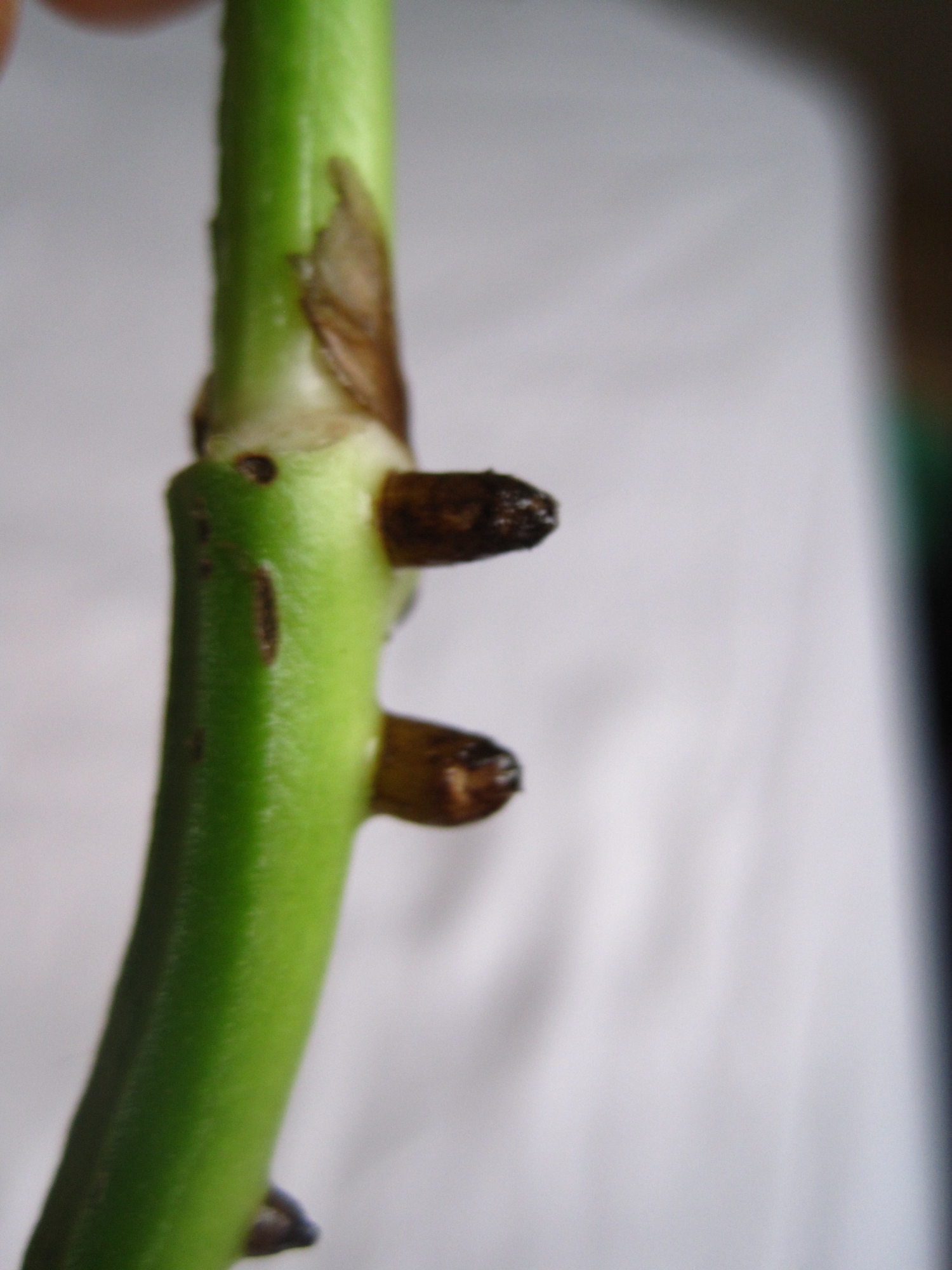 edit: Die braunen Erhebungen sind Luftwurzeln. Die bilden sich im Wasser dann zu normalen Wurzeln aus. Danach kannst du sie in Erde umtopfen.