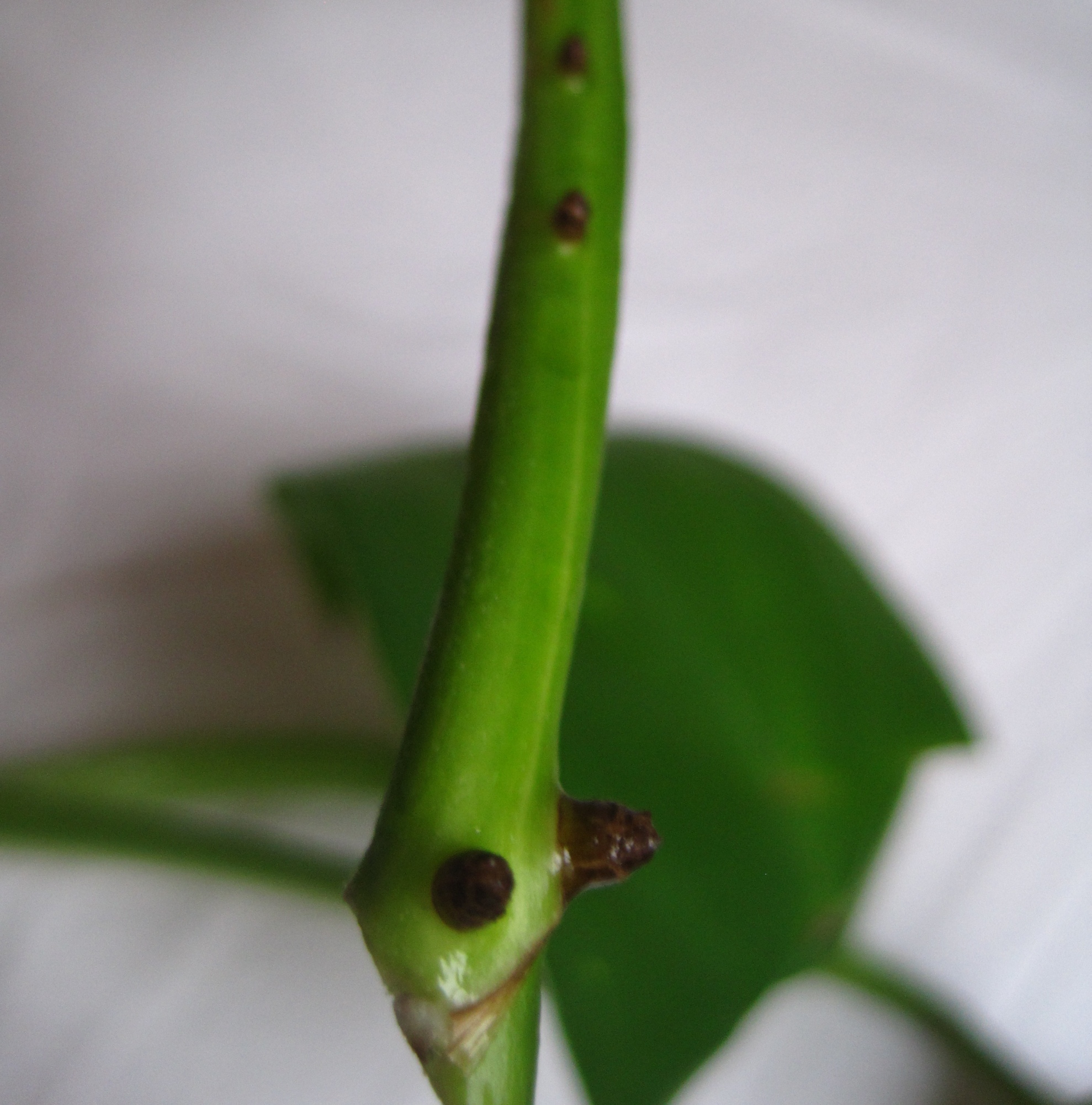 habe diesen steckling geschenkt bekommen und frage mich, was für eine pflanze das ist. ich vermute es ist eine hoya? wenn ja würde mich die genaue art interessieren. ich frage mich auch, ob die braunen erhebungen zur pflanze gehören oder schädlinge sind? würde mich über jegliche tipps sehr freuen.