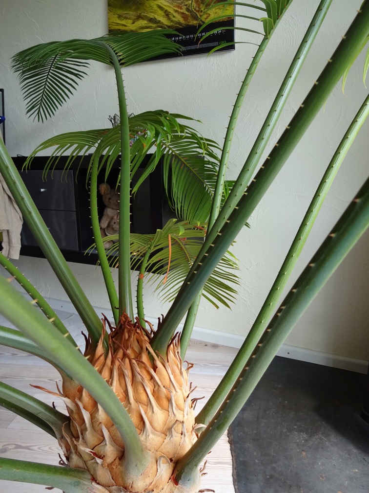 Ich habe hier seit bestimmt schon 15 Jahren eine Palme in mehr oder weniger guter Pflege, von der ich nicht genau weiß, welche Art es ist. Könnte wohl gut eine Phoenix-Art sein, aber was mich dabei irritiert, sind die extrem kurzen Dornen und die in sich nach unten gewölbten, glänzend grünen Blätter. Ich muss sie wohl zum Verkauf anbieten, denn sie wird zu groß fürs Wohnzimmer und da wäre es schön, wenn ich sie genau bezeichnen kann.