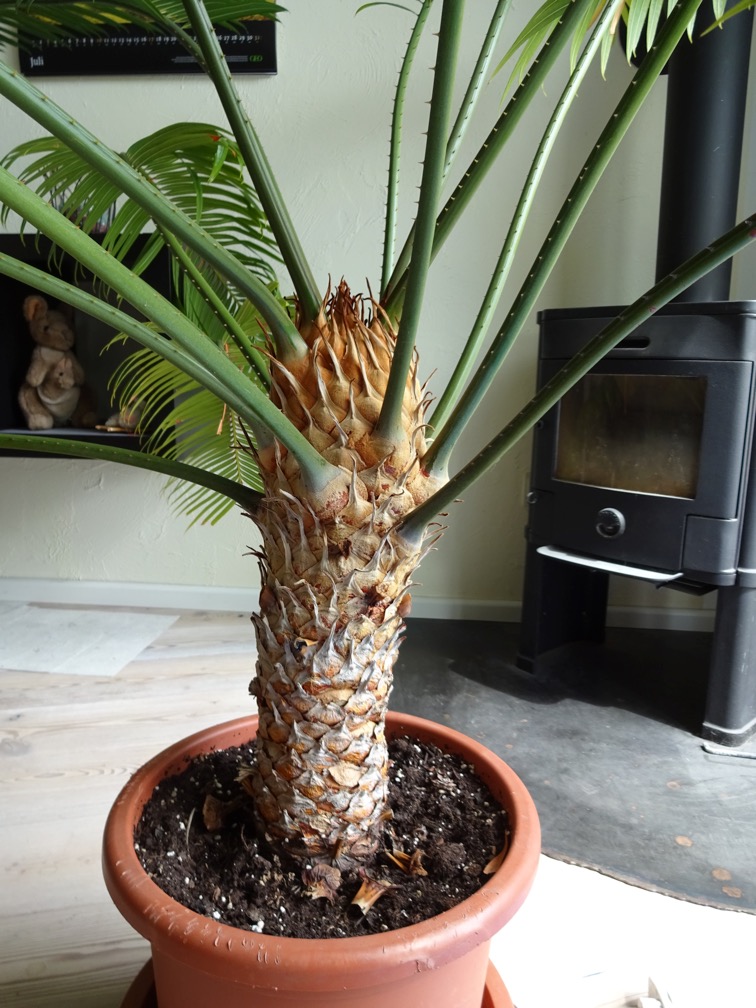 Ich habe hier seit bestimmt schon 15 Jahren eine Palme in mehr oder weniger guter Pflege, von der ich nicht genau weiß, welche Art es ist. Könnte wohl gut eine Phoenix-Art sein, aber was mich dabei irritiert, sind die extrem kurzen Dornen und die in sich nach unten gewölbten, glänzend grünen Blätter. Ich muss sie wohl zum Verkauf anbieten, denn sie wird zu groß fürs Wohnzimmer und da wäre es schön, wenn ich sie genau bezeichnen kann.