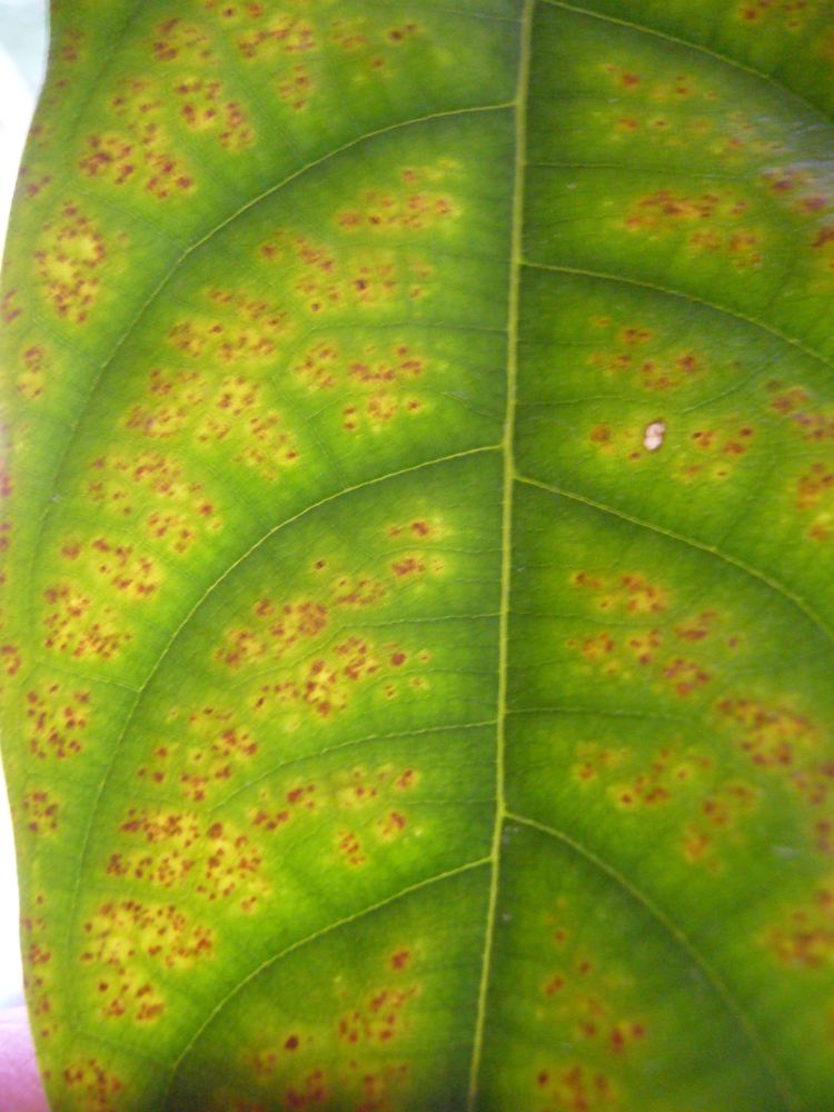 Begonnen hat es mit eisenmangelmäßigen Entfärbungen. Daraufhin habe ich die Pflanzen mit Lapacho-Tee gegossen und im Abstand von gut einer Woche zwei Mal mit "Grünpflanzendünger" gedüngt, einmal in normaler, einmal in halber Konzentration. Umgetopft hab ich sie auch, schon vor Wochen. Die Färbung ging nicht zurück. Dann kamen die Flecken. Beides zeigen alle drei Jacks; stehen direkt nebeneinander.