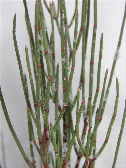 Ich würde dann sagen, dass es der eigenartige Strauch ist, der Triebe wie ein Schachtelhalm hat und in botanischen Gärten rumsteht (oder bei mir im Steingarten). Schneit es in botanischen Gärten üblicherweise nicht oder meinst du in den Gewächshäusern? Schachtelhalme sind bei uns eigentlich zu dieser Jahreszeit draußen nicht mehr auffindbar. Die gesuchte Pflanze ist also ein winterharter, immergrüner Strauch.