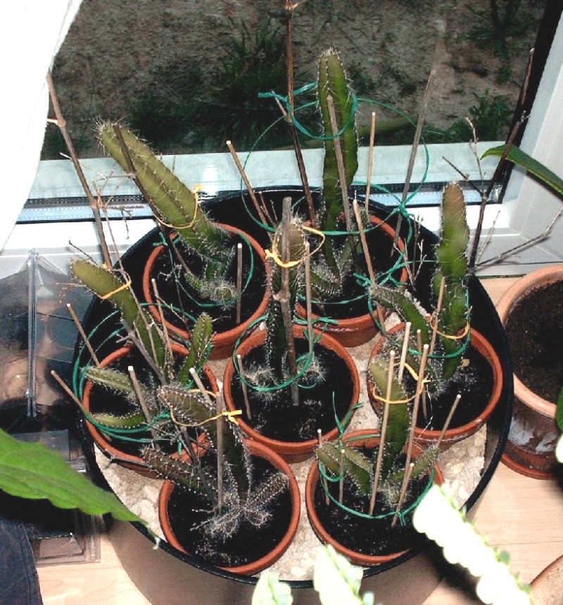 bekommen und ich hoffe, sie krabbeln jetzt fleissig weiter. das war meine samstagsbeschäftigung: aus samen gezogene, gut 1/2 jahr alte pithayas umtopfen und für jede einen krabbelkäftig basteln und dann ab in die große kiste - war ganz schön fieselig - weil die kleinen biester stechen was das zeug hält aber frau hat ja sonst nix zu tun