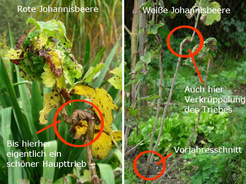 Letztes Jahr zeigten die Triebspitzen der weißen und roten Sorte dann erstmals auffällige Verkrüppelungen (siehe Bilder), und bildeten kaum noch neue Haupttriebe. Ausserdem litten die Triebspitzen unter extremen Blattlausbefall.