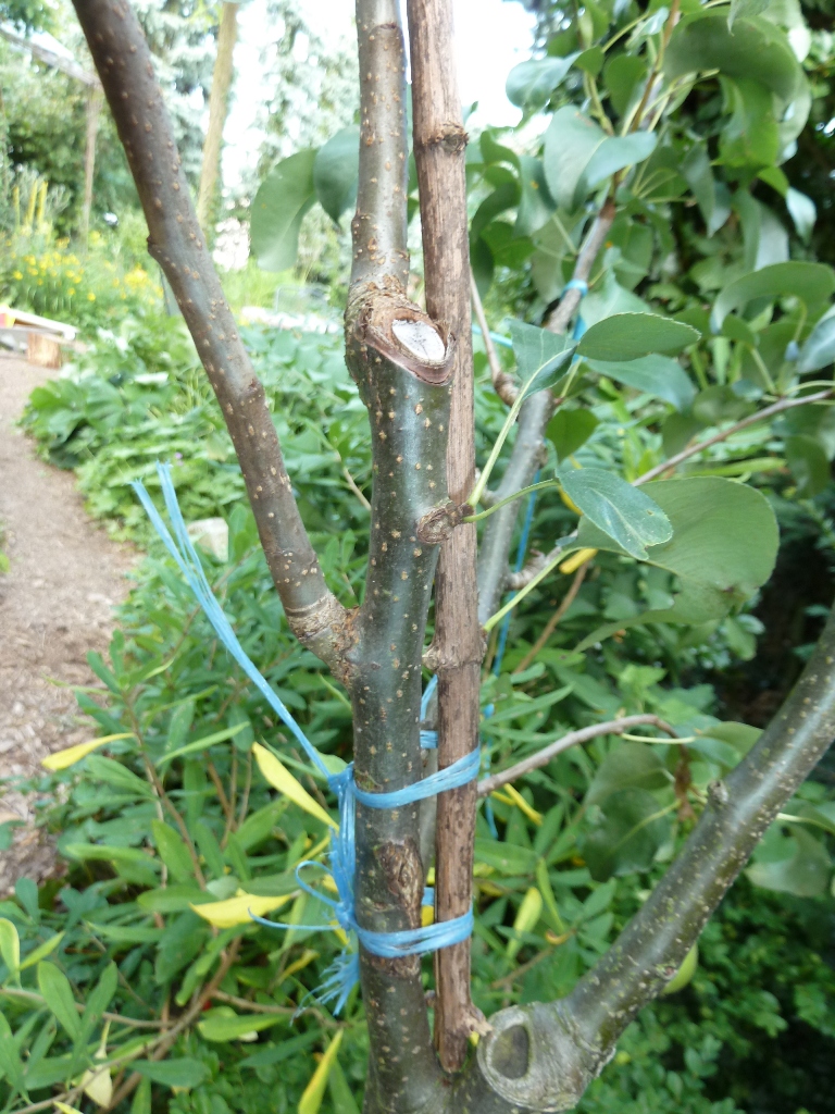 Bei einem Birnchen habe ich die herabhängenden Fruchtruten mit Stäben geschient. Einer der Sprüche bei den Schnittkursen die ich seinerzeit besuchte war: "Mit Binden ist mehr Geld zu verdienen als mit Schneiden".