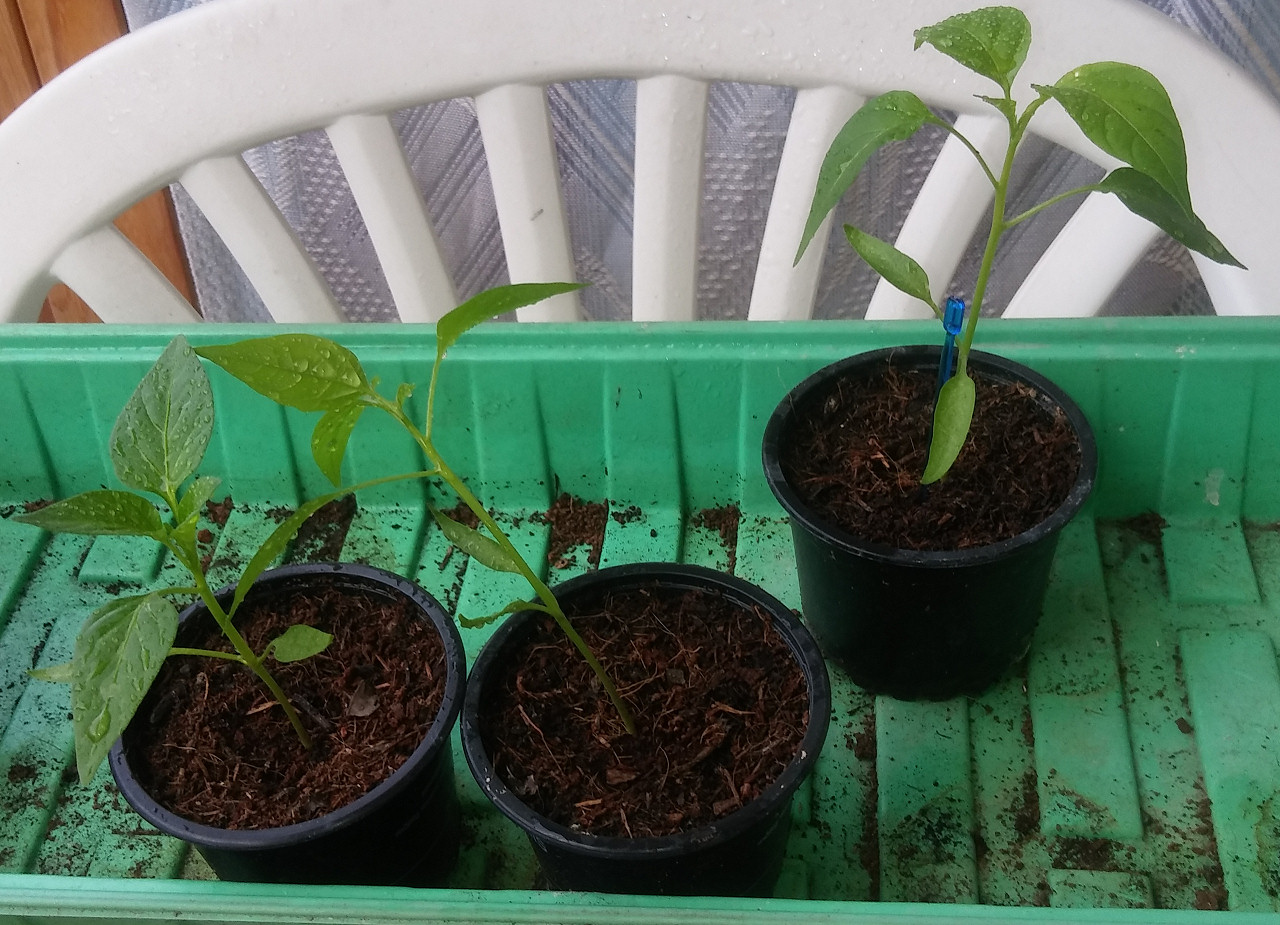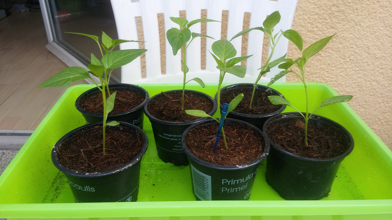 Meine Chilis dürften jetzt wohl um die 2 Monate alt sein ungefähr, weiß es grad gar nicht genau. Sie haben sich anfangs ziemlich Zeit gelassen und sind in der letzten Zeit aber im Eiltempo aus den neuen Töpfchen rausgewachsen und brauchen höchstwahrscheinlich mehr Platz nach unten. Werde die größten wohl heute noch umtopfen. Hab nur leider keine Töpfe mit Zwischengröße, sie müssten dann entweder in die Töpfe wo die Rosen drin waren, die wirklich deutlich größer sind als die, die sie jetzt noch haben. Oder in 3er Grüppchen in Balkonkästen umsiedeln, die entsprechend auch recht groß sind.