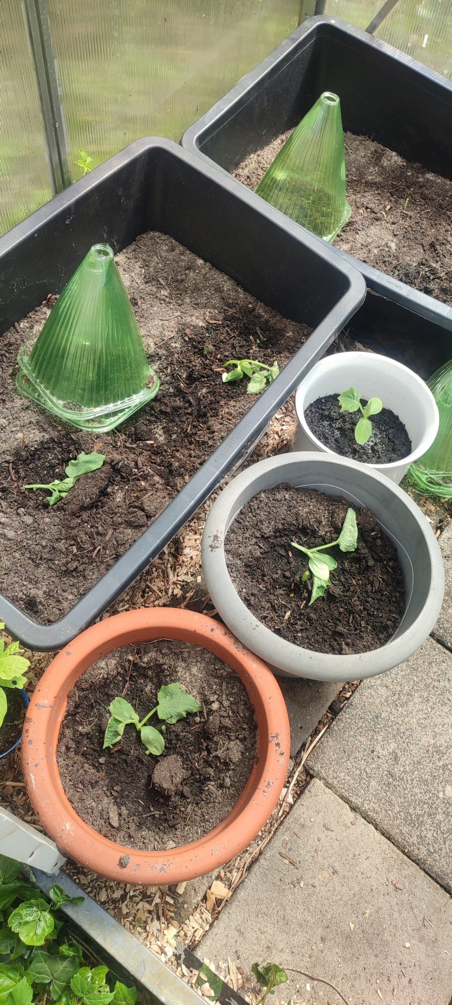 Den Tomaten gefällt es auch wunderbar, bloß mit den Gurken habe ich ein sonderbares Problem. Zuerst ging es ihnen gut, bloß nach und nach ist jede Gurkenpflanze am Stiel wie durchgeknabbert. Ich habe weder Schnecken noch Kellerasseln noch Mäuse gesehen. Die Gurkenpflanzen habe ich auch mit Pflanzhüten geschützt, die standen immer an Ort und Stelle, waren nicht umgekippt, aber die Pflanzen waren am Stiel durch und die Pflanze lag unangefressen daneben. Der Stiel der Gurke war auch nicht matschig oder gammelig, es waren kräftige Jungpflanzen.