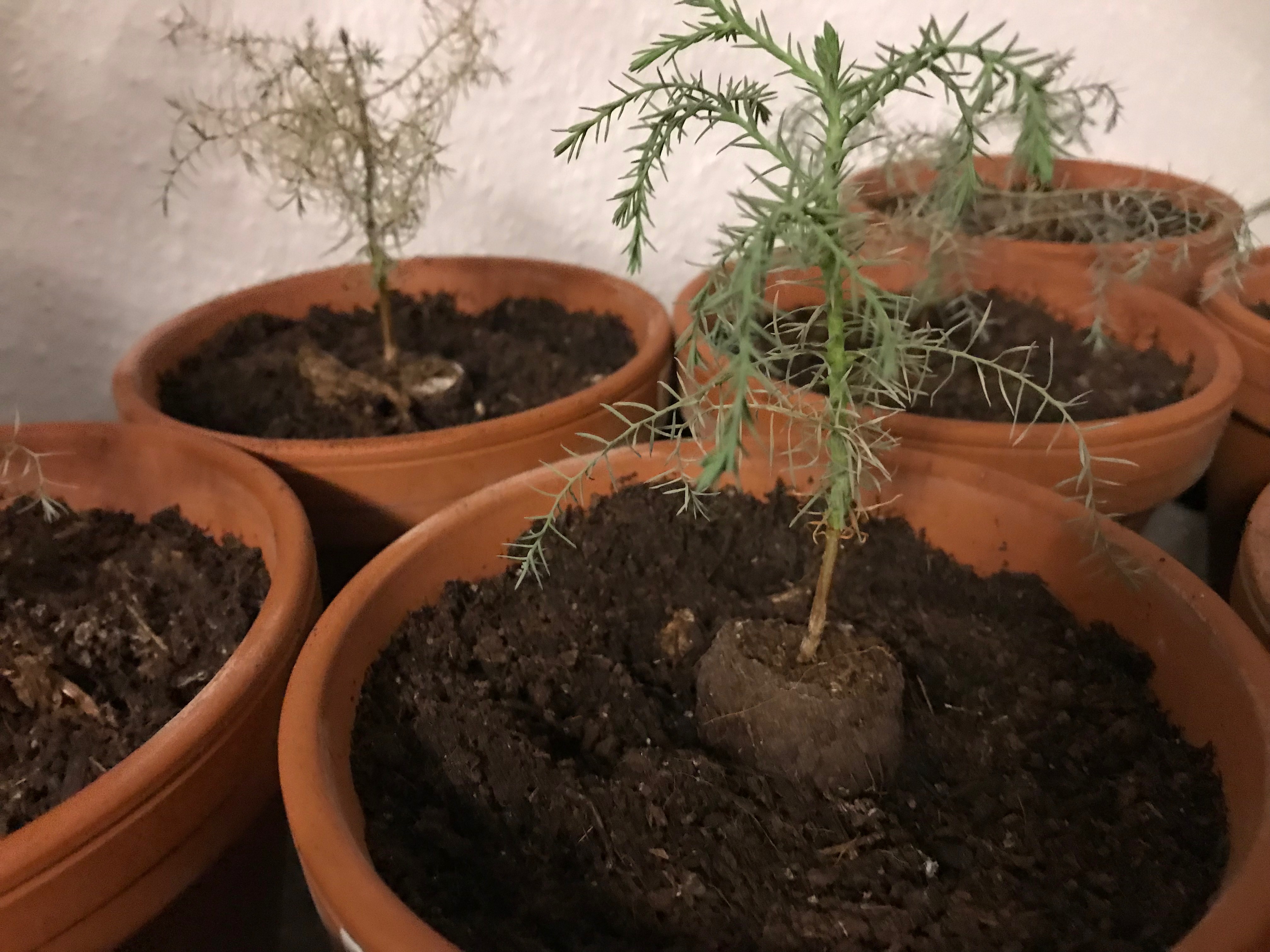 Die Bäume wurden vor 2 Wochen aus 8x8x12 Töpfen in Tontöpfe umgetopft.