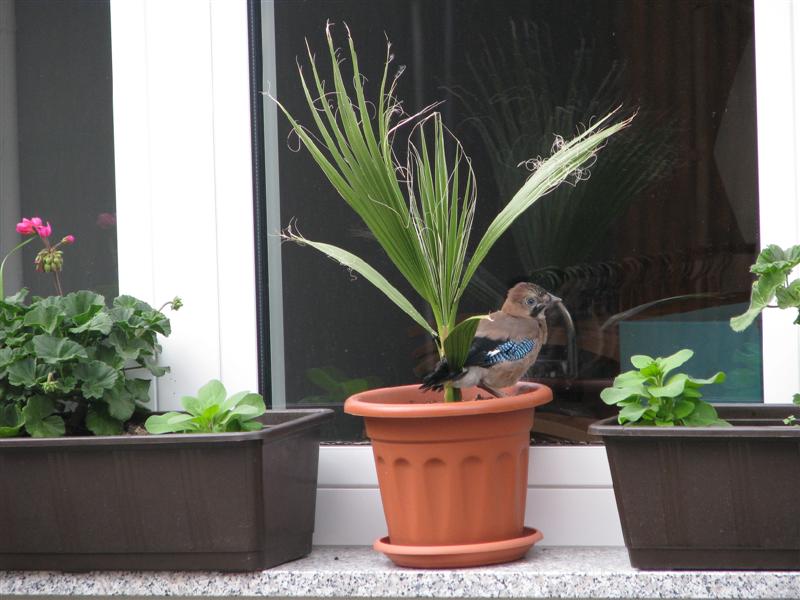 Wir haben seit etwa 2 Stunden einen jungen Eichelhäher bei uns im Hof. Er wird offensichtlich nicht gefüttert von seinen Eltern und sitzt ziemlich verängstigt rum. Die Flugversuche macht er immer in Richtung Wand und da kommt er nicht weit hoch. Stößt halt immer wieder mit dem Köpfchen gegen Hindernisse.