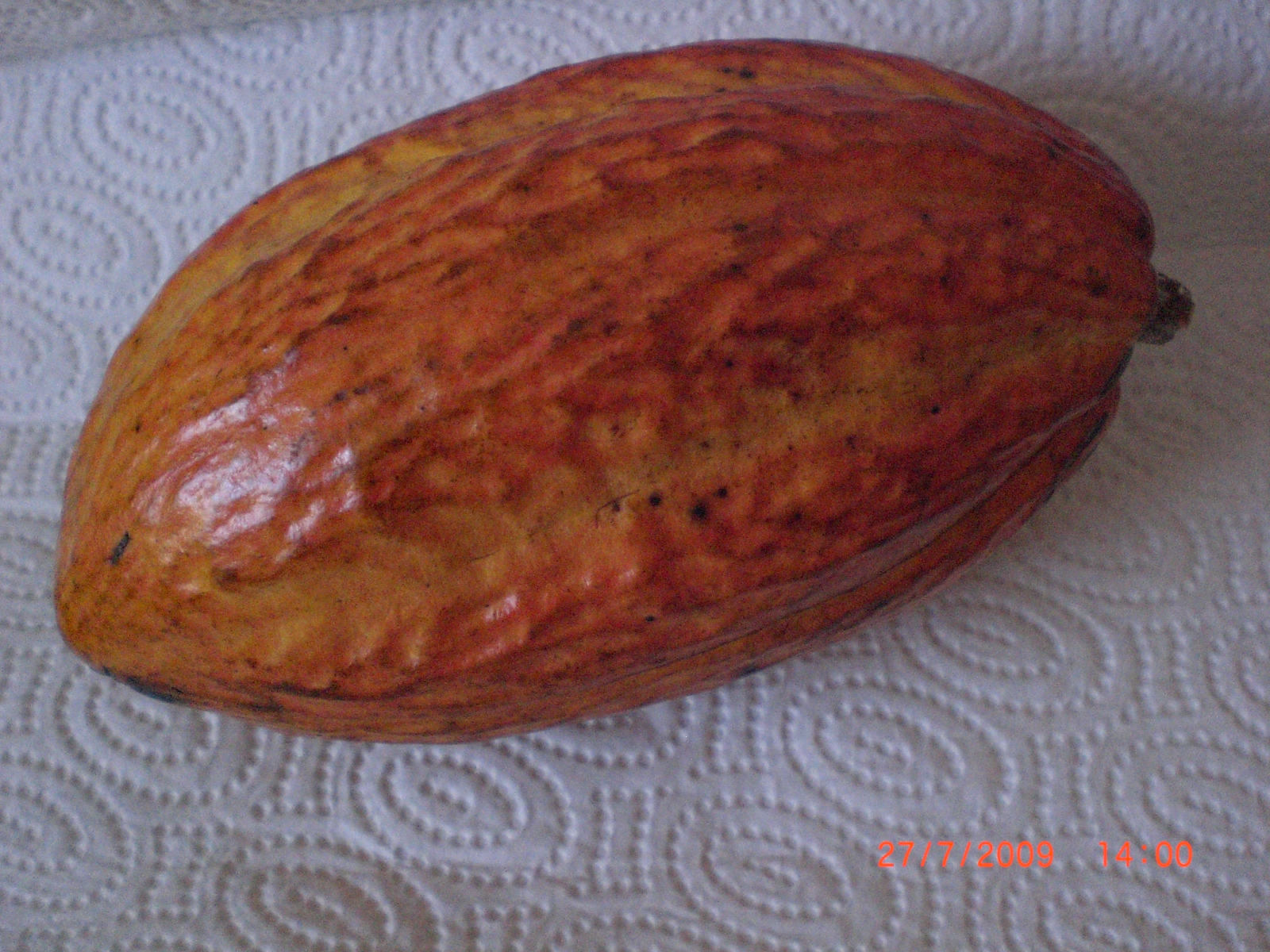 Ha! Und da ist mein Prachtstück, eine adrette Kakaoschote! Leider hab ich beim Kauf nicht gesehen, das der Stielansatz schimmlig aussieht (Nach dem Kauf hab ich sie 2 Stunden lang in meiner Tasche mitgeschleppt, aber das wird ja wohl kaum deswegen passiert sein. Jetzt wo ich sie wieder in den Kühlschrank gelegt hab, war sie noch schön kühl.). Ich hoffe, das sich das nicht auf meine Kakaobohnen auswirkt. Mein Händler war so nett sie seit meiner telefonischen Bestellung im Kühlschrank zu lagern.