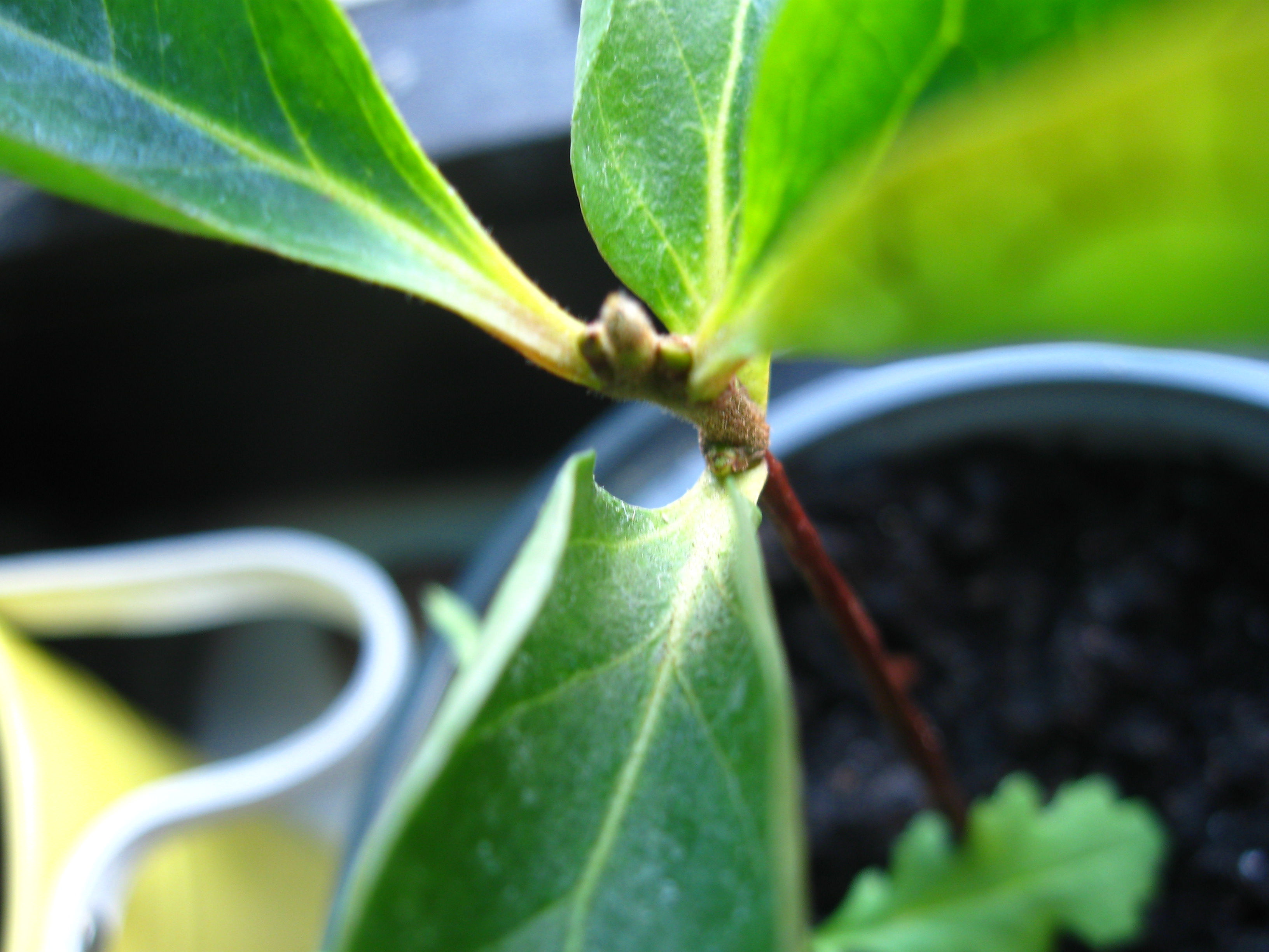 Außerdem habe ich auch noch eine Granate auf der Fensterbank stehen, die wohl auch ihr Laub abwerfen will. Die ist auch erst diesen Sommer geboren. Die Granate sollte aber doch eher drinnen bleiben oder?