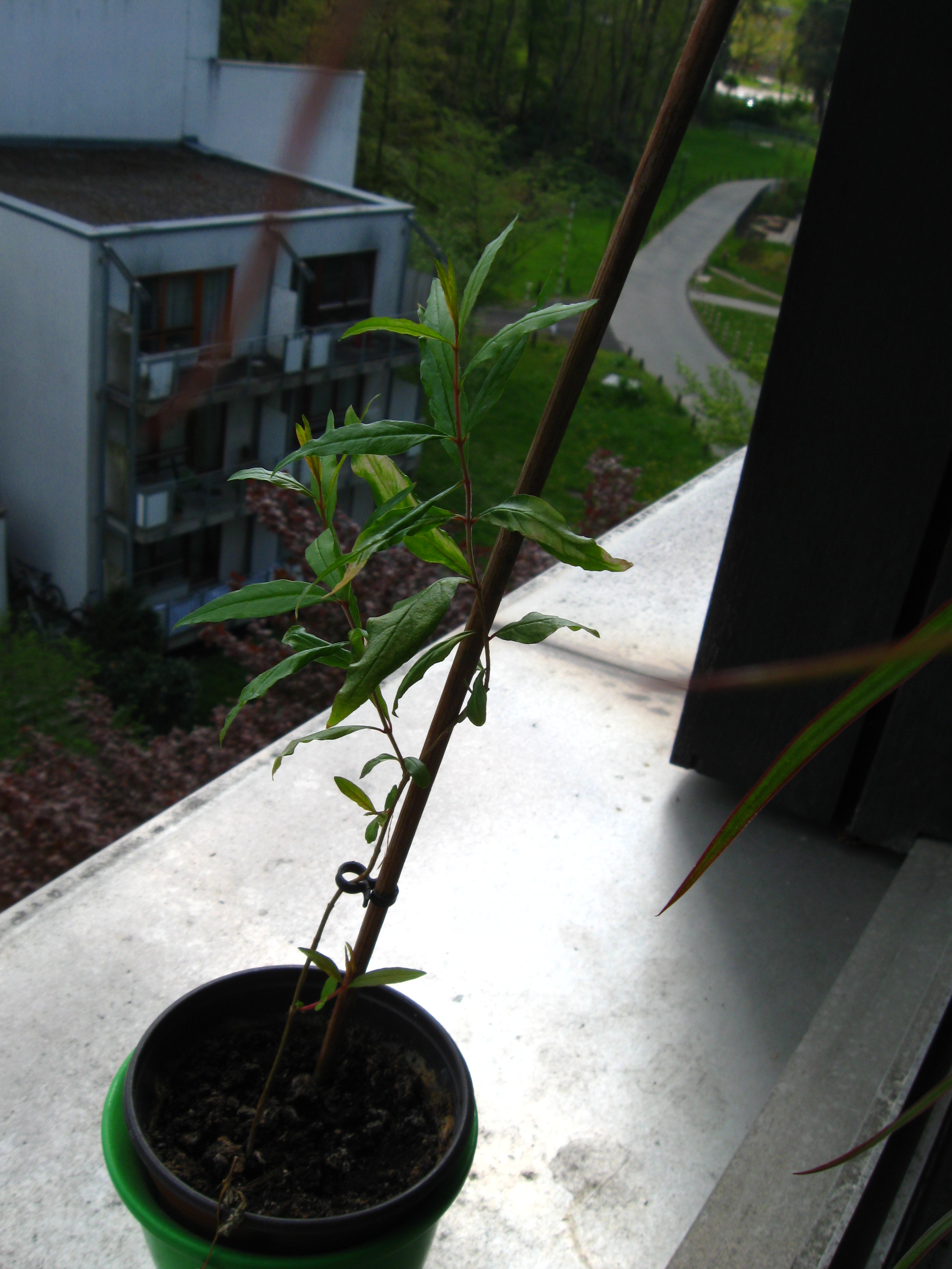 Außerdem habe ich auch noch eine Granate auf der Fensterbank stehen, die wohl auch ihr Laub abwerfen will. Die ist auch erst diesen Sommer geboren. Die Granate sollte aber doch eher drinnen bleiben oder?